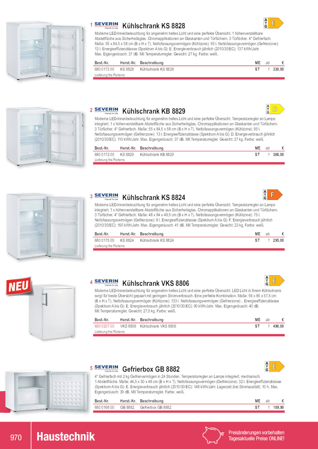 1 Kühlschrank KS 8828 Moderne LED-Innenbeleuchtung für angenehm helles Licht und eine perfekte Übersicht. 1 höhenverstellbare Abstellfläche aus Sicherheitsglas. Chromapplikationen an Glaskanten und Türfächern. 3 Türfächer. 4* Gefrierfach. Maße: 55 x 84,5 x 58 cm (B x H x T). Nettofassungsvermögen (Kühlzone): 95 l. Nettofassungsvermögen (Gefrierzone): 13 l. Energieeffizienzklasse (Spektrum A bis G): E. Energieverbrauch jährlich (2010/30/EC): 137 kWh/Jahr. Max. Eigengeräusch: 37 dB. Mit Temperaturregler. Gewicht: 27 kg. Farbe: weiß. Best.-Nr. Herst.-Nr. Beschreibung 680 0173 00 KS 8828 Kühlschrank KS 8828 Lieferung frei Parterre. ME ab € ST 1 330,00 2 Kühlschrank KB 8829 DA G Moderne LED-Innenbeleuchtung für angenehm helles Licht und eine perfekte Übersicht. Temperaturregler an Lampe integriert. 1 x höhenverstellbare Abstellfläche aus Sicherheitsglas. Chromapplikationen an Glaskanten und Türfächern. 3 Türfächer. 4* Gefrierfach. Maße: 55 x 84,5 x 58 cm (B x H x T). Nettofassungsvermögen (Kühlzone): 95 l. Nettofassungsvermögen (Gefrierzone): 13 l. Energieeffizienzklasse (Spektrum A bis G): D. Energieverbrauch jährlich (2010/30/EC): 110 kWh/Jahr. Max. Eigengeräusch: 37 dB. Mit Temperaturregler. Gewicht: 27 kg. Farbe: weiß. Best.-Nr. Herst.-Nr. Beschreibung 680 0172 00 KS 8829 Kühlschrank KB 8829 Lieferung frei Parterre. ME ab € ST 1 366,00 3 Kühlschrank KS 8824 Moderne LED-Innenbeleuchtung für angenehm helles Licht und eine perfekte Übersicht. Temperaturregler an Lampe integriert. 1 x höhenverstellbare Abstellfläche aus Sicherheitsglas. Chromapplikationen an Glaskanten und Türfächern. 3 Türfächer. 4* Gefrierfach. Maße: 48 x 84 x 49,5 cm (B x H x T). Nettofassungsvermögen (Kühlzone): 75 l. Nettofassungsvermögen (Gefrierzone): 8 l. Energieeffizienzklasse (Spektrum A bis G): F. Energieverbrauch jährlich (2010/30/EC): 160 kWh/Jahr. Max. Eigengeräusch: 41 dB. Mit Temperaturregler. Gewicht: 23 kg. Farbe: weiß. Best.-Nr. Herst.-Nr. Beschreibung 680 0175 00 KS 8824 Kühlschrank KS 8824 Lieferung frei Parterre. ME ab € ST 1 295,00 4 Kühlschrank VKS 8806 Moderne LED-Innenbeleuchtung für angenehm helles Licht und eine perfekte Übersicht. LED Licht in Ihrem Kühlschrank sorgt für beste Übersicht gepaart mit geringem Stromverbrauch. Eine perfekte Kombination. Maße: 56 x 85 x 57,5 cm (B x H x T). Nettofassungsvermögen (Kühlzone): 133 l. Nettofassungsvermögen (Gefrierzone): . Energieeffizienzklasse (Spektrum A bis G): E. Energieverbrauch jährlich (2010/30/EC): 90 kWh/Jahr. Max. Eigengeräusch: 40 dB. Mit Temperaturregler. Gewicht: 27,5 kg. Farbe: weiß. Best.-Nr. Herst.-Nr. Beschreibung 680 0207 00 VKS 8806 Kühlschrank VKS 8806 Lieferung frei Parterre. ME ab € ST 1 490,00 5 Gefrierbox GB 8882 4* Gefrierfach mit 2 kg Gefriervermögen in 24 Stunden. Temperaturregler an Lampe integriert, mechanisch. 1 Abstellfläche. Maße: 44,5 x 50 x 48 cm (B x H x T). Nettofassungsvermögen (Gefrierzone): 32 l. Energieeffizienzklasse (Spektrum A bis G): E. Energieverbrauch jährlich (2010/30/EC): 148 kWh/Jahr. Lagerzeit (bei Stromausfall): 10 h. Max. Eigengeräusch: 39 dB. Mit Temperaturregler. Farbe: weiß. Best.-Nr. Herst.-Nr. Beschreibung 680 0168 00 GB 8882 Gefrierbox GB 8882 ME ab € ST 1 189,90 970 Haustechnik Preisänderungen vorbehalten Tagesaktuelle Preise ONLINE! 680017500 680017300 680016800 680017200 680020700