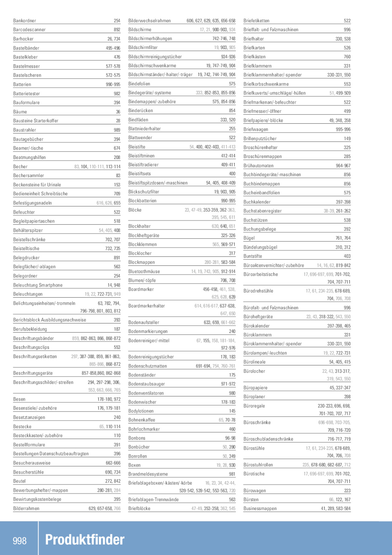 Bankordner 254 Barcodescanner 892 Barhocker 26, 734 Bastelbänder 495-496 Bastelkleber 476 Bastelmesser 577-578 Bastelscheren 572-575 Batterien 990-995 Batterietester 982 Bauformulare 394 Bäume 36 Bausteine Starterkoffer 28 Baustrahler 989 Bautagebücher 394 Beamer/-tische 674 Beatmungshilfen 208 Becher 83, 104, 110-111, 113-114 Bechersammler 83 Beckensteine für Urinale 153 Bedieneinheit Schreibtische 709 Befestigungsnadeln 616, 626, 655 Befeuchter 522 Begleitpapiertaschen 518 Behälterspitzer 54, 405, 408 Beistellschränke 702, 707 Beistelltische 732, 735 Belegdrucker 891 Belegfächer/-ablagen 563 Belegordner 254 Beleuchtung Smartphone 14, 948 Beleuchtungen 19, 22, 722-731, 949 Belichtungseinheiten/-trommeln 63, 782, 794, 796-798, 801, 803, 812 Berichtsblock Ausbildungsnachweise 393 Berufsbekleidung 187 Beschriftungsbänder 859, 862-863, 866, 868-872 Beschriftungsclips 553 Beschriftungsetiketten 297, 387-388, 859, 861-863, 865-866, 868-872 Beschriftungsgeräte 857-858,860, 862-868 Beschriftungsschilder/-streifen 294, 297-298, 306, 553, 663, 666, 765 Besen 178-180, 972 Besenstiele/-zubehöre 176, 179-181 Besetztanzeigen 240 Bestecke 65, 110-114 Besteckkasten/-zubehöre 110 Bestellformulare 391 Bestellungen Datenschutzbeauftragten 396 Besucherausweise 663-666 Besucherstühle 690, 734 Beutel 272, 842 Bewerbungshefter/-mappen 280-281, 284 Bewirtungskostenbelege 395 Bilderrahmen 629, 657-658, 766 Bilderwechselrahmen 606, 627, 629, 635, 656-658 Bildschirme 17, 21, 900-903, 934 Bildschirmerhöhungen 742-746, 748 Bildschirmfilter 19, 903, 905 Bildschirmreinigungstücher 934-936 Bildschirmschwenkarme 19, 747-749, 904 Bildschirmständer/-halter/-träger 19, 742, 744-749, 904 Bindefolien 575 Bindegeräte/-systeme 333, 852-853, 855-856 Bindemappen/-zubehöre 575, 854-856 Binderücken 854 Bindfäden 333, 520 Blattniederhalter 255 Blattwender 522 Bleistifte 54, 400, 402-403, 411-413 Bleistiftminen 412-414 Bleistiftradierer 409-411 Bleistiftsets 400 Bleistiftspitzdosen/-maschinen 54, 405, 408-409 Blickschutzfilter 19, 903, 905 Blockbatterien 990-995 Blöcke 23, 47-49, 353-359, 362-363, 395, 545, 611 Blockhalter 630, 640, 651 Blockheftgeräte 325-326 Blockklemmen 565, 569-571 Blocklocher 317 Blockmappen 280-281, 583-584 Bluetoothmäuse 14, 19, 743, 905, 912-914 Blumen/-töpfe 706, 708 Boardmarker 456-458, 461, 538, 625, 628, 639 Boardmarkerhalter 614, 616-617, 637-638, 647, 650 Bodenaufsteller 633, 659, 661-662 Bodenmarkierungen 240 Bodenreiniger/-mittel 67, 155, 158, 181-184, 972-976 Bodenreinigungstücher 178, 183 Bodenschutzmatten 691-694, 754, 760-761 Bodenständer 175 Bodenstaubsauger 971-972 Bodenventilatoren 980 Bodenwischer 178-183 Bodylotionen 145 Bohnenkaffee 65, 70-78 Bohrlochmarker 460 Bonbons 96-98 Bonbücher 50, 390 Bonrollen 50, 349 Boxen 19, 28, 930 Brandmeldesysteme 981 Briefablageboxen/-kästen/-körbe 16, 23, 34, 42-44, 539-542, 539-542, 553-563, 720 Briefablagen-Trennwände 563 Briefblöcke 47-49, 353-358, 362, 545 Briefetiketten 522 Brieffalt- und Falzmaschinen 996 Briefhalter 330, 538 Briefkarten 526 Briefkästen 760 Briefklammern 331 Briefklammernhalter/-spender 330-331, 550 Briefkorbschwenkarme 553 Briefkuverts/-umschläge/-hüllen 51, 499-509 Briefmarkenan/-befeuchter 522 Briefmesser/-öffner 499 Briefpapiere/-blöcke 49, 348, 358 Briefwaagen 995-996 Brillenputztücher 149 Broschürenhefter 325 Broschürenmappen 285 Brühautomaten 964-967 Buchbindegeräte/-maschinen 856 Buchbindemappen 856 Bucheinbandfolien 575 Buchkalender 397-398 Buchstabenregister 38-39, 261-262 Buchstützen 538 Buchungsbelege 392 Bügel 761, 764 Bündelungsbügel 310, 312 Buntstifte 403 Büroaktenvernichter/-zubehöre 14, 16, 62, 819-842 Büroarbeitstische 17, 696-697, 699, 701-702, 704, 707-711 Bürodrehstühle 17, 61, 234-235, 678-689, 704, 706, 708 Bürofalt- und Falzmaschinen 996 Büroheftgeräte 23, 43, 318-322, 543, 550 Bürokalender 397-398, 465 Büroklammern 331 Büroklammernhalter/-spender 330-331, 550 Bürolampen/-leuchten 19, 22, 722-731 Bürolineale 54, 405, 415 Bürolocher 22, 43, 313-317, 319, 543, 550 Büropapiere 45, 337-347 Büroplaner 398 Büroregale 230-233, 696, 698, 701-703, 707, 717 Büroschränke 696-698, 703-705, 709, 716-720 Büroschubladenschränke 716-717, 719 Bürostühle 17, 61, 234-235, 678-689, 704, 706, 708 Bürostuhlrollen 235, 678-680, 682-687, 712 Bürotische 17, 696-697, 699, 701-702, 704, 707-711 Bürowagen 223 Bürsten 66, 122, 167 Businessmappen 41, 289, 583-584 998 Produktfinder