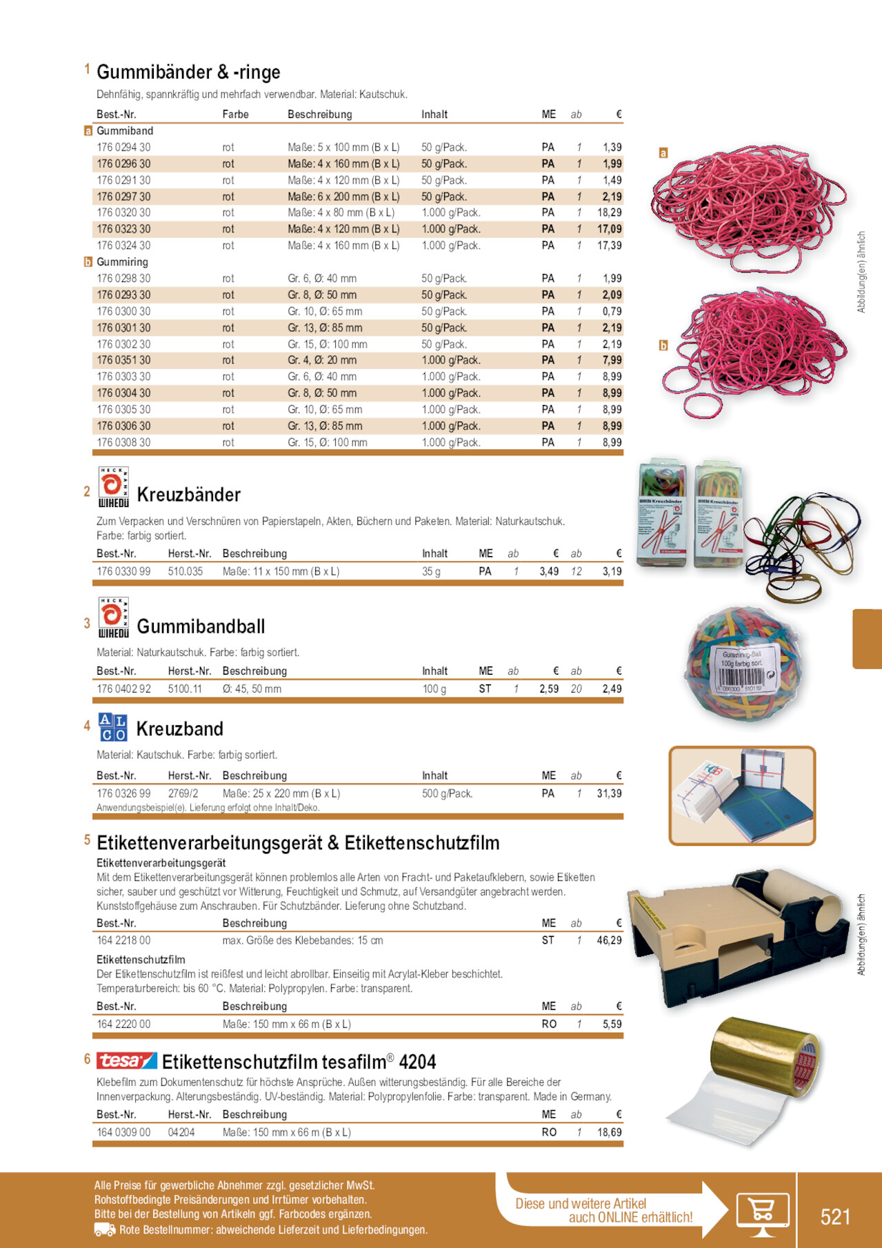 1 Gummibänder & -ringe Dehnfähig, spannkräftig und mehrfach verwendbar. Material: Kautschuk. Best.-Nr. a Gummiband 176 0294 30 176 0296 30 176 0291 30 176 0297 30 176 0320 30 176 0323 30 176 0324 30 b Gummiring 176 0298 30 176 0293 30 176 0300 30 176 0301 30 176 0302 30 176 0351 30 176 0303 30 176 0304 30 176 0305 30 176 0306 30 176 0308 30 Farbe rot rot rot rot rot rot rot rot rot rot rot rot rot rot rot rot rot rot Beschreibung Maße: 5 x 100 mm (B x L) Maße: 4 x 160 mm (B x L) Maße: 4 x 120 mm (B x L) Maße: 6 x 200 mm (B x L) Maße: 4 x 80 mm (B x L) Maße: 4 x 120 mm (B x L) Maße: 4 x 160 mm (B x L) Gr. 6, Ø: 40 mm Gr. 8, Ø: 50 mm Gr. 10, Ø: 65 mm Gr. 13, Ø: 85 mm Gr. 15, Ø: 100 mm Gr. 4, Ø: 20 mm Gr. 6, Ø: 40 mm Gr. 8, Ø: 50 mm Gr. 10, Ø: 65 mm Gr. 13, Ø: 85 mm Gr. 15, Ø: 100 mm Inhalt 50 g/Pack. 50 g/Pack. 50 g/Pack. 50 g/Pack. 1.000 g/Pack. 1.000 g/Pack. 1.000 g/Pack. 50 g/Pack. 50 g/Pack. 50 g/Pack. 50 g/Pack. 50 g/Pack. 1.000 g/Pack. 1.000 g/Pack. 1.000 g/Pack. 1.000 g/Pack. 1.000 g/Pack. 1.000 g/Pack. ME ab € PA 1 1,39 PA 1 1,99 PA 1 1,49 PA 1 2,19 PA 1 18,29 PA 1 17,09 PA 1 17,39 PA 1 1,99 PA 1 2,09 PA 1 0,79 PA 1 2,19 PA 1 2,19 PA 1 7,99 PA 1 8,99 PA 1 8,99 PA 1 8,99 PA 1 8,99 PA 1 8,99 a b 2 Kreuzbänder Zum Verpacken und Verschnüren von Papierstapeln, Akten, Büchern und Paketen. Material: Naturkautschuk. Farbe: farbig sortiert. Best.-Nr. Herst.-Nr. Beschreibung Inhalt ME ab € ab 176 0330 99 510.035 Maße: 11 x 150 mm (B x L) 35 g PA 1 3,49 12 € 3,19 3 Gummibandball Material: Naturkautschuk. Farbe: farbig sortiert. Best.-Nr. Herst.-Nr. Beschreibung 176 0402 92 5100.11 Ø: 45, 50 mm Inhalt 100 g ME ab € ab € ST 1 2,59 20 2,49 4 Kreuzband Material: Kautschuk. Farbe: farbig sortiert. Best.-Nr. Herst.-Nr. Beschreibung 176 0326 99 2769/2 Maße: 25 x 220 mm (B x L) Anwendungsbeispiel(e). Lieferung erfolgt ohne Inhalt/Deko. Inhalt 500 g/Pack. ME ab € PA 1 31,39 5 Etikettenverarbeitungsgerät & Etikettenschutzfilm Etikettenverarbeitungsgerät Mit dem Etikettenverarbeitungsgerät können problemlos alle Arten von Fracht- und Paketaufklebern, sowie Etiketten sicher, sauber und geschützt vor Witterung, Feuchtigkeit und Schmutz, auf Versandgüter angebracht werden. Kunststoffgehäuse zum Anschrauben. Für Schutzbänder. Lieferung ohne Schutzband. Best.-Nr. Beschreibung ME ab € 164 2218 00 max. Größe des Klebebandes: 15 cm ST 1 46,29 Etikettenschutzfilm Der Etikettenschutzfilm ist reißfest und leicht abrollbar. Einseitig mit Acrylat-Kleber beschichtet. Temperaturbereich: bis 60 °C. Material: Polypropylen. Farbe: transparent. Best.-Nr. Beschreibung ME ab € 164 2220 00 Maße: 150 mm x 66 m (B x L) RO 1 5,59 6 Etikettenschutzfilm tesafilm® 4204 Klebefilm zum Dokumentenschutz für höchste Ansprüche. Außen witterungsbeständig. Für alle Bereiche der Innenverpackung. Alterungsbeständig. UV-beständig. Material: Polypropylenfolie. Farbe: transparent. Made in Germany. Best.-Nr. Herst.-Nr. Beschreibung ME ab € 164 0309 00 04204 Maße: 150 mm x 66 m (B x L) RO 1 18,69 Alle Preise für gewerbliche Abnehmer zzgl. gesetzlicher MwSt. Rohstoffbedingte Preisänderungen und Irrtümer vorbehalten. Bitte bei der Bestellung von Artikeln ggf. Farbcodes ergänzen. Rote Bestellnummer: abweichende Lieferzeit und Lieferbedingungen. Diese und weitere Artikel auch ONLINE erhältlich! 521 Abbildung(en) ähnlich Abbildung(en) ähnlich 176029630 176030830 176029130 176029730 164222000 176029430 176029830 176032030 176029330 176030130 176040292 176032430 164221800 176030030 176033099 176030230 176030530 164030900 176035130 176032330 176030630 176030430 176030330 176032699