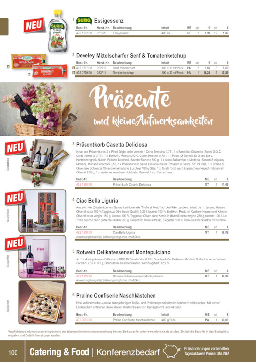 1 Essigessenz Best.-Nr. Herst.-Nr. Beschreibung 492 1252 00 251525 Essigessenz Inhalt 400 ml ME ab € ab € ST 1 1,99 12 1,89 a b 2 Develey Mittelscharfer Senf & Tomatenketchup Best.-Nr. a 492 0727 00 b 492 0729 00 Herst.-Nr. Beschreibung 032519 Senf, mittelscharf 032711 Tomatenketchup Inhalt ME ab € ab € 100 x 15 ml/Pack. PA 1 6,89 3 6,69 100 x 20 ml/Pack. PA 1 13,39 3 12,89 Präsente und kleine Aufmerksamkeiten Beispielfoto Beispielfoto 3 Präsentkorb Casetta Deliciosa Inhalt des Präsentkorbs 2 x Pinot Grigio delle Venezie · Corte Seresina 0,75 l, 1 x Bardolino Chiaretto (Rosé) D.O.C. Corte Seresina 0,75 l, 1 x Bardolino Rosso D.O.C. Corte Seresina 0,75 l, 1 x Pasta Di Semola Di Grano Duro, Hartweizengrieß-Nudeln Fattorie Lucchesi, Bavette Bianche 500 g, 1 x Aceto Balsamico di Modena, Balsam-Essig aus Modena, Monari Federzoni 0,5 l, 1 x Pomodorini in Salsa Giò Sole Kleine Tomaten in Sauce 720 ml Glas, 1 x Crema di Olive nere Schwarze Olivencreme Fattorie Lucchesi 180 g Glas, 1 x Taralli Tondi nach klassischem Rezept mit nativem Olivenöl 250 g, 1 x wiederverwendbare Holzkiste. Material: Holz. Farbe: braun. Best.-Nr. 492 1280 00 Beschreibung Präsentkorb Casetta Deliciosa ME ab € ST 1 81,69 4 Ciao Bella Liguria Aus allen vier Zutaten können Sie das traditionenelle "Trofie al Pesto" auf den Teller zaubern. Inhalt: Je 1 x tacento Natives Olivenöl extra 100 % Taggiasca Olive beste Qualität 0,25 l, tacento 100 % Basilikum Pesto mit Cashew-Nüssen und Käse in Olivenöl extra vergine 180 g, tacento 100 % Taggiasca Oliven ohne Kerne in Olivenöl extra vergine 230 g, tacento 100 % Le Trofie Secche dünn gedrehte Nudeln 250 g, Rezept für Trofie al Pesto, Eleganter 100 % Olive-Geschenkkarton mit Schleife. Best.-Nr. Beschreibung 492 1278 00 Ciao Bella Liguria Anwendungsbeispiel(e). Lieferung erfolgt ohne Inhalt/Deko. ME ab € ST 1 48,89 5 Rotwein Delikatessenset Montepulciano Je 1 x Montepulciano d' Abbruzzo DOC Di Camillo Vini 0,75 l, Geschenk-Set Catànies Mandeln Collection verschiedene Sorten 5 x 35 = 175 g, Dekorativer Geschenkkarton. Alkoholgehalt: 12,5 %. Best.-Nr. Beschreibung 492 1279 00 Rotwein Delikatessenset Montepulciano Anwendungsbeispiel(e). Lieferung erfolgt ohne Inhalt/Deko. ME ab € ST 1 30,99 6 Praline Confiserie Naschkästchen Eine verführerische Auslese handgefertigter Trüffel- und Pralinenspezialitäten im schönen Holzkästchen. Mit echter Leidenschaft entstehen diese kleinen Köstlichkeiten von Hand geformt und dekoriert. Best.-Nr. 492 0021 00 Beschreibung Praline Confiserie Naschkästchen Inhalt 400 g/Pack. ME ab € PA 1 30,09 Verpflichtende Informationen entsprechend der Lebensmittelinformationsverordnung können Sie kostenfrei unter www.info-klick.de abrufen. Einfach die Best.-Nr. in den Suchschlitz eingeben und Detailinformationen abrufen. 100 Catering & Food | Konferenzbedarf Preisänderungen vorbehalten Tagesaktuelle Preise ONLINE! Beispielfoto Beispielfoto 492127800 492127900 492125200 492002100 492072900 492128000 492072700
