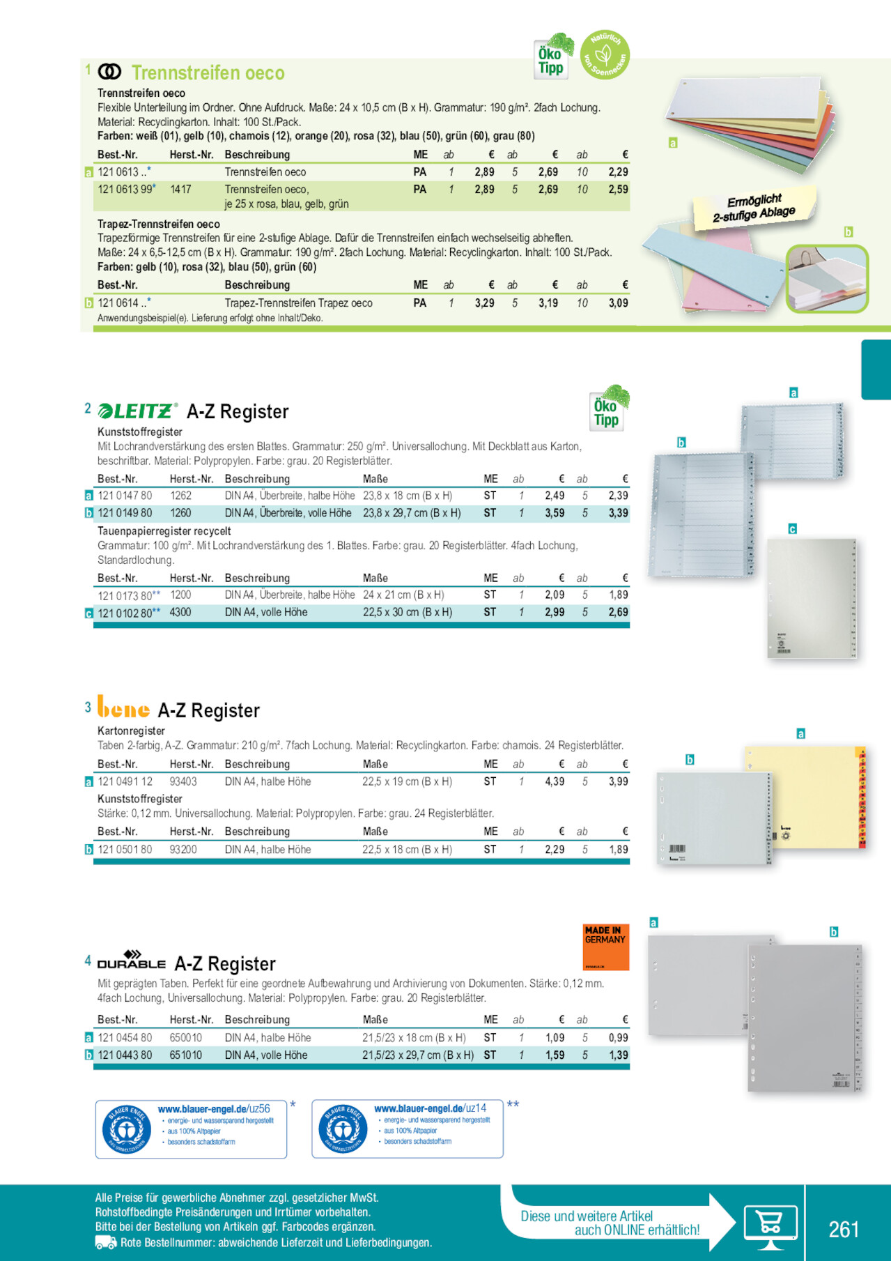 1 Trennstreifen oeco Trennstreifen oeco Flexible Unterteilung im Ordner. Ohne Aufdruck. Maße: 24 x 10,5 cm (B x H). Grammatur: 190 g/m². 2fach Lochung. Material: Recyclingkarton. Inhalt: 100 St./Pack. Farben: weiß (01), gelb (10), chamois (12), orange (20), rosa (32), blau (50), grün (60), grau (80) Best.-Nr. a 121 0613 ..* 121 0613 99* Herst.-Nr. 1417 Beschreibung Trennstreifen oeco Trennstreifen oeco, je 25 x rosa, blau, gelb, grün ME ab € ab € ab € PA 1 2,89 5 2,69 10 2,29 PA 1 2,89 5 2,69 10 2,59 Trapez-Trennstreifen oeco Trapezförmige Trennstreifen für eine 2-stufige Ablage. Dafür die Trennstreifen einfach wechselseitig abheften. Maße: 24 x 6,5-12,5 cm (B x H). Grammatur: 190 g/m². 2fach Lochung. Material: Recyclingkarton. Inhalt: 100 St./Pack. Farben: gelb (10), rosa (32), blau (50), grün (60) Best.-Nr. Beschreibung b 121 0614 ..* Trapez-Trennstreifen Trapez oeco Anwendungsbeispiel(e). Lieferung erfolgt ohne Inhalt/Deko. ME ab € ab € ab € PA 1 3,29 5 3,19 10 3,09 a 2-sEturfimgöegAlicbhlat ge b 2 A-Z Register Kunststoffregister Mit Lochrandverstärkung des ersten Blattes. Grammatur: 250 g/m². Universallochung. Mit Deckblatt aus Karton, beschriftbar. Material: Polypropylen. Farbe: grau. 20 Registerblätter. Best.-Nr. Herst.-Nr. Beschreibung Maße ME ab € ab a 121 0147 80 1262 DIN A4, Überbreite, halbe Höhe 23,8 x 18 cm (B x H) ST 1 2,49 5 b 121 0149 80 1260 DIN A4, Überbreite, volle Höhe 23,8 x 29,7 cm (B x H) ST 1 3,59 5 Tauenpapierregister recycelt Grammatur: 100 g/m². Mit Lochrandverstärkung des 1. Blattes. Farbe: grau. 20 Registerblätter. 4fach Lochung, Standardlochung. Best.-Nr. Herst.-Nr. Beschreibung Maße ME ab € ab 121 0173 80** 1200 DIN A4, Überbreite, halbe Höhe 24 x 21 cm (B x H) ST 1 2,09 5 c 121 0102 80** 4300 DIN A4, volle Höhe 22,5 x 30 cm (B x H) ST 1 2,99 5 € 2,39 3,39 € 1,89 2,69 b a c 3 A-Z Register Kartonregister Taben 2-farbig, A-Z. Grammatur: 210 g/m². 7fach Lochung. Material: Recyclingkarton. Farbe: chamois. 24 Registerblätter. Best.-Nr. Herst.-Nr. Beschreibung Maße ME ab € ab € a 121 0491 12 93403 DIN A4, halbe Höhe 22,5 x 19 cm (B x H) ST 1 4,39 5 3,99 Kunststoffregister Stärke: 0,12 mm. Universallochung. Material: Polypropylen. Farbe: grau. 24 Registerblätter. Best.-Nr. Herst.-Nr. Beschreibung Maße ME ab € ab € b 121 0501 80 93200 DIN A4, halbe Höhe 22,5 x 18 cm (B x H) ST 1 2,29 5 1,89 b a 4 A-Z Register Mit geprägten Taben. Perfekt für eine geordnete Aufbewahrung und Archivierung von Dokumenten. Stärke: 0,12 mm. 4fach Lochung, Universallochung. Material: Polypropylen. Farbe: grau. 20 Registerblätter. Best.-Nr. a 121 0454 80 b 121 0443 80 Herst.-Nr. Beschreibung 650010 DIN A4, halbe Höhe 651010 DIN A4, volle Höhe Maße ME 21,5/23 x 18 cm (B x H) ST 21,5/23 x 29,7 cm (B x H) ST ab 1 1 € ab 1,09 5 1,59 5 € 0,99 1,39 * ** Alle Preise für gewerbliche Abnehmer zzgl. gesetzlicher MwSt. Rohstoffbedingte Preisänderungen und Irrtümer vorbehalten. Bitte bei der Bestellung von Artikeln ggf. Farbcodes ergänzen. Rote Bestellnummer: abweichende Lieferzeit und Lieferbedingungen. Diese und weitere Artikel auch ONLINE erhältlich! a b 261 121050180 121010280 121017380 121014980 121045480 121014780 121044380 121049112