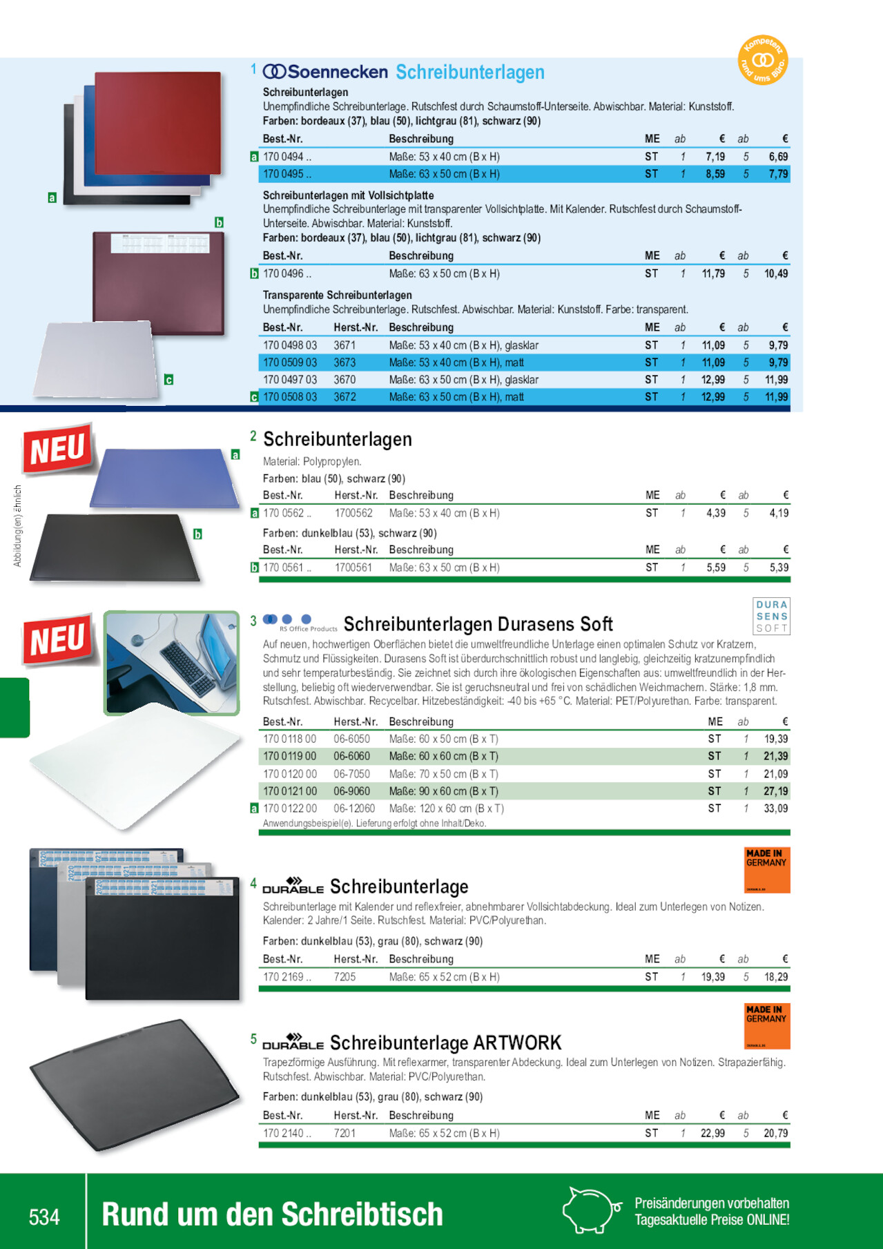 Abbildung(en) ähnlich 1 Schreibunterlagen Schreibunterlagen Unempfindliche Schreibunterlage. Rutschfest durch Schaumstoff-Unterseite. Abwischbar. Material: Kunststoff. Farben: bordeaux (37), blau (50), lichtgrau (81), schwarz (90) Best.-Nr. Beschreibung ME ab € ab a 170 0494 .. Maße: 53 x 40 cm (B x H) ST 1 7,19 5 170 0495 .. Maße: 63 x 50 cm (B x H) ST 1 8,59 5 € 6,69 7,79 a Schreibunterlagen mit Vollsichtplatte Unempfindliche Schreibunterlage mit transparenter Vollsichtplatte. Mit Kalender. Rutschfest durch Schaumstoff- b Unterseite. Abwischbar. Material: Kunststoff. Farben: bordeaux (37), blau (50), lichtgrau (81), schwarz (90) Best.-Nr. Beschreibung ME ab € ab € b 170 0496 .. Maße: 63 x 50 cm (B x H) ST 1 11,79 5 10,49 Transparente Schreibunterlagen Unempfindliche Schreibunterlage. Rutschfest. Abwischbar. Material: Kunststoff. Farbe: transparent. Best.-Nr. Herst.-Nr. Beschreibung ME ab € ab € 170 0498 03 3671 Maße: 53 x 40 cm (B x H), glasklar ST 1 11,09 5 9,79 170 0509 03 3673 Maße: 53 x 40 cm (B x H), matt ST 1 11,09 5 9,79 c 170 0497 03 3670 Maße: 63 x 50 cm (B x H), glasklar ST 1 12,99 5 11,99 c 170 0508 03 3672 Maße: 63 x 50 cm (B x H), matt ST 1 12,99 5 11,99 2 Schreibunterlagen a Material: Polypropylen. Farben: blau (50), schwarz (90) Best.-Nr. Herst.-Nr. Beschreibung a 170 0562 .. 1700562 Maße: 53 x 40 cm (B x H) b Farben: dunkelblau (53), schwarz (90) Best.-Nr. Herst.-Nr. Beschreibung b 170 0561 .. 1700561 Maße: 63 x 50 cm (B x H) ME ab ST 1 € ab 4,39 5 € 4,19 ME ab ST 1 € ab 5,59 5 € 5,39 3 Schreibunterlagen Durasens Soft Auf neuen, hochwertigen Oberflächen bietet die umweltfreundliche Unterlage einen optimalen Schutz vor Kratzern, Schmutz und Flüssigkeiten. Durasens Soft ist überdurchschnittlich robust und langlebig, gleichzeitig kratzunempfindlich und sehr temperaturbeständig. Sie zeichnet sich durch ihre ökologischen Eigenschaften aus: umweltfreundlich in der Herstellung, beliebig oft wiederverwendbar. Sie ist geruchsneutral und frei von schädlichen Weichmachern. Stärke: 1,8 mm. Rutschfest. Abwischbar. Recycelbar. Hitzebeständigkeit: -40 bis +65 °C. Material: PET/Polyurethan. Farbe: transparent. Best.-Nr. Herst.-Nr. Beschreibung ME ab € 170 0118 00 06-6050 Maße: 60 x 50 cm (B x T) 170 0119 00 06-6060 Maße: 60 x 60 cm (B x T) 170 0120 00 06-7050 Maße: 70 x 50 cm (B x T) 170 0121 00 06-9060 Maße: 90 x 60 cm (B x T) a 170 0122 00 06-12060 Maße: 120 x 60 cm (B x T) Anwendungsbeispiel(e). Lieferung erfolgt ohne Inhalt/Deko. ST 1 19,39 ST 1 21,39 ST 1 21,09 ST 1 27,19 ST 1 33,09 4 Schreibunterlage Schreibunterlage mit Kalender und reflexfreier, abnehmbarer Vollsichtabdeckung. Ideal zum Unterlegen von Notizen. Kalender: 2 Jahre/1 Seite. Rutschfest. Material: PVC/Polyurethan. Farben: dunkelblau (53), grau (80), schwarz (90) Best.-Nr. 170 2169 .. Herst.-Nr. Beschreibung 7205 Maße: 65 x 52 cm (B x H) ME ab € ab € ST 1 19,39 5 18,29 5 Schreibunterlage ARTWORK Trapezförmige Ausführung. Mit reflexarmer, transparenter Abdeckung. Ideal zum Unterlegen von Notizen. Strapazierfähig. Rutschfest. Abwischbar. Material: PVC/Polyurethan. Farben: dunkelblau (53), grau (80), schwarz (90) Best.-Nr. Herst.-Nr. Beschreibung ME ab € ab € 170 2140 .. 7201 Maße: 65 x 52 cm (B x H) ST 1 22,99 5 20,79 534 Rund um den Schreibtisch Preisänderungen vorbehalten Tagesaktuelle Preise ONLINE! 170049703 170012000 170214080 170216990 170216980 170012100 170214053 170214090 170049437 170049650 170049581 170049537 170012200 170011800 170049690 170049681 170216953 170056190 170050803 170049803 170011900 170049550 170049450 170049590 170056250 170049490 170050903 170049481 170056153 170049637 170056290