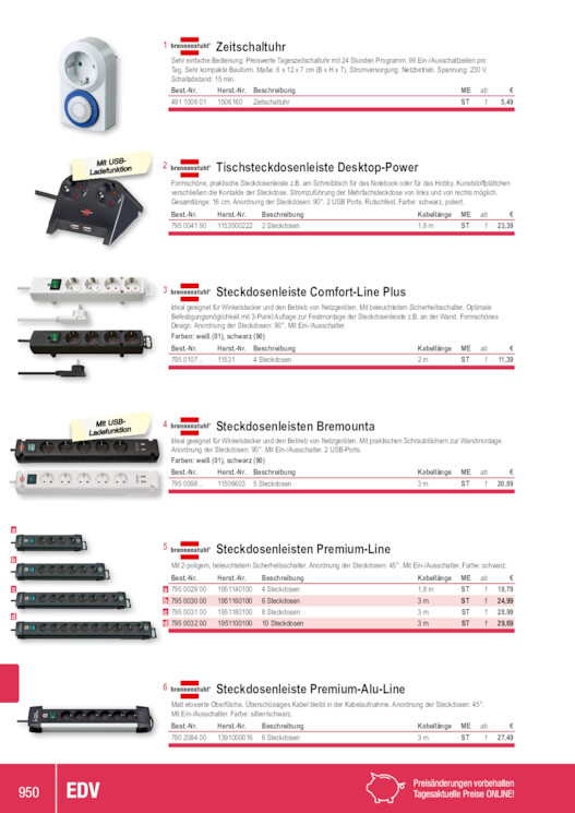 1 Zeitschaltuhr Sehr einfache Bedienung. Preiswerte Tageszeitschaltuhr mit 24 Stunden Programm. 96 Ein-/Ausschaltzeiten pro Tag. Sehr kompakte Bauform. Maße: 6 x 12 x 7 cm (B x H x T). Stromversorgung: Netzbetrieb. Spannung: 230 V. Schaltabstand: 15 min. Best.-Nr. Herst.-Nr. Beschreibung ME ab 491 1009 01 1506160 Zeitschaltuhr ST 1 € 5,49 LaMdeitfuUnSkBtio- n 2 Tischsteckdosenleiste Desktop-Power Formschöne, praktische Steckdosenleiste z.B. am Schreibtisch für das Notebook oder für das Hobby. Kunststoffplättchen verschließen die Kontakte der Steckdose. Stromzuführung der Mehrfachsteckdose von links und von rechts möglich. Gesamtlänge: 16 cm. Anordnung der Steckdosen: 90°. 2 USB Ports. Rutschfest. Farbe: schwarz, poliert. Best.-Nr. Herst.-Nr. Beschreibung 795 0041 90 1153500222 2 Steckdosen Kabellänge ME ab € 1,8 m ST 1 23,39 3 Steckdosenleiste Comfort-Line Plus Ideal geeignet für Winkelstecker und den Betrieb von Netzgeräten. Mit beleuchtetem Sicherheitsschalter. Optimale Befestigungsmöglichkeit mit 3-Punkt Auflage zur Festmontage der Steckdosenleiste z.B. an der Wand. Formschönes Design. Anordnung der Steckdosen: 90°. Mit Ein-/Ausschalter. Farben: weiß (01), schwarz (90) Best.-Nr. Herst.-Nr. Beschreibung Kabellänge ME ab € 795 0107 .. 11531 4 Steckdosen 2 m ST 1 11,39 LaMdeitfuUnSkBtio- n 4 Steckdosenleisten Bremounta Ideal geeignet für Winkelstecker und den Betrieb von Netzgeräten. Mit praktischen Schraublöchern zur Wandmontage. Anordnung der Steckdosen: 90°. Mit Ein-/Ausschalter. 2 USB-Ports. Farben: weiß (01), schwarz (90) Best.-Nr. Herst.-Nr. Beschreibung Kabellänge ME ab € 795 0098 .. 11506603 5 Steckdosen 3 m ST 1 20,89 a 5 Steckdosenleisten Premium-Line b Mit 2-poligem, beleuchtetem Sicherheitsschalter. Anordnung der Steckdosen: 45°. Mit Ein-/Ausschalter. Farbe: schwarz. Best.-Nr. Herst.-Nr. Beschreibung Kabellänge ME ab € c a 795 0029 00 1951140100 4 Steckdosen 1,8 m ST 1 18,79 b 795 0030 00 1951160100 6 Steckdosen 3 m ST 1 24,99 d c 795 0031 00 1951180100 8 Steckdosen 3 m ST 1 28,99 d 795 0032 00 1951100100 10 Steckdosen 3 m ST 1 29,69 950 EDV 6 Steckdosenleiste Premium-Alu-Line Matt eloxierte Oberfläche. Überschüssiges Kabel bleibt in der Kabelaufnahme. Anordnung der Steckdosen: 45°. Mit Ein-/Ausschalter. Farbe: silber/schwarz. Best.-Nr. Herst.-Nr. Beschreibung 790 2084 00 1391000016 6 Steckdosen Kabellänge ME ab 3 m ST 1 € 27,49 Preisänderungen vorbehalten Tagesaktuelle Preise ONLINE! 491100901 795003200 795010701 795009801 795009890 795003000 795002900 795003100 790208400 795010790 795004190