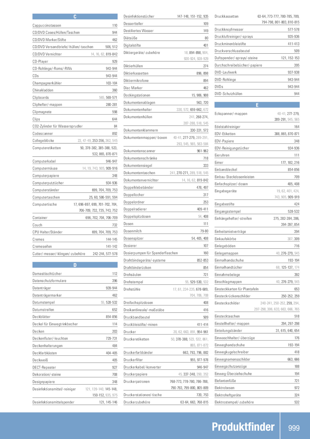 C Cappuccinotassen 110 CD/DVD Cases/Hüllen/Taschen 944 CD/DVD Marker/Stifte 462 CD/DVD Versandbriefe/-hüllen/-taschen 506, 512 CD/DVD Vernichter 14, 16, 62, 819-842 CD-Player 929 CD-Rohlinge/-Roms/-RWs 943-944 CDs 943-944 Champagnerkühler 103-104 Chinakladden 360 Clipboards 565, 569-571 Cliphefter/-mappen 280-281 Clipmagnete 598 Clips 644 CO2-Zylinder für Wassersprudler 84 Codescanner 892 Collegeblöcke 23, 47-49, 353-356, 362, 545 Computeretiketten 50, 378-382, 385-388, 523, 532, 865, 870-871 Computerkabel 946-947 Computermäuse 14, 19, 743, 905, 909-916 Computerpapiere 348 Computerputztücher 934-936 Computerständer 699, 704, 709, 753 Computertaschen 25, 60, 586-591, 594 Computertische 17, 696-697, 699, 701-702, 704, 706-709, 732, 735, 743, 752 Container 696, 702, 704, 706-709 Couch 732 CPU Halter/Ständer 699, 704, 709, 753 Cremes 144-145 Cremeseifen 141-142 Cutter/-messer/-klingen/-zubehöre 242-244, 577-578 D Damasttischtücher Datenschutzformulare Datenträger Datenträgermarker Datumstempel Datumstreifen Deckblätter Deckel für Einwegtrinkbecher Decken Deckenfluter/-leuchten Deckenhalterungen Deckfarbkästen Deckweiß DECT-Repeater Dekoration/-steine Designpapiere Desinfektionsmittel/-reiniger Desinfektionsmittelspender 112 396 939-944 462 55, 528-532 652 854-856 114 203 729-731 484 404-405 405 927 708 348 121, 139-140, 145-148, 150-152, 935, 975 121, 145-146 Desinfektionstücher 147-148, 151-152, 935 Dessertteller 109 Destiliertes Wasser 149 Diätsüße 80 Digitalstifte 401 Diktiergeräte/-zubehöre 18, 894-898, 904, 920-924, 928-929 Diktierhüllen 274 Diktierkassetten 896, 898 Diktiermikrofone 894 Disc Marker 462 Dockingstationen 15, 906, 908 Dokumentenablagen 563, 720 Dokumentenhalter 330, 572, 659-662, 672 Dokumentenhüllen 241, 268-274, 287-288, 518, 545 Dokumentenklammern 330-331, 572 Dokumentenmappen/-boxen 40-41, 277-279, 289-291, 293, 545, 565, 583-584 Dokumentenscanner 961-962 Dokumentenschränke 718 Dokumentensiegel 333 Dokumententaschen 241, 270-271, 289, 518, 545 Dokumentenvernichter 14, 16, 62, 819-842 Doppelklebebänder 478, 497 Doppellocher 317 Doppelordner 253 Doppelradierer 409-411 Doppelspitzdosen 54, 408 Dosen 111 Dosenmilch 79-80 Dosenspitzer 54, 405, 408 Dosierer 107 Dosierpumpen für Spenderflaschen 160 Drahtbindegeräte/-systeme 852-853 Drahtbinderücken 854 Drehsäulen 721 Drehstempel 55, 529-530, 532 Drehstühle 17, 61, 234-235, 678-689, 704, 706, 708 Dreifachspitzdosen 408 Dreikantlineale/-maßstäbe 416 Druckbandbeutel 509 Druckbleistifte/-minen 411-414 Drucker 20, 62, 663, 891, 954-961 Druckeretiketten 50, 378-388, 523, 532, 861, 865, 871-872 Druckerfarbbänder 663, 793, 796, 882 Druckerfilter 955, 977-978 Druckerkabel/-konverter 946-947 Druckerpapiere 45, 337-348, 350, 352 Druckerpatronen 768-773, 778-780, 786-788, 790-793, 799-800, 805-809 Druckerstationen/-tische 720, 753 Druckerzubehöre 63-64, 663, 768-815 Druckkassetten 63-64, 773-777, 780-785, 789, 794-798, 801-803, 810-815 Druckknopfmesser 577-578 Druckluftreiniger/-sprays 935-936 Druckminenbleistifte 411-413 Druckverschlussbeutel 509 Duftspender/-sprays/-steine 121, 152-153 Durchschreibebücher/-papiere 395 DVD-Laufwerk 937-938 DVD-Rohlinge 943-944 DVDs 943-944 DVD-Schutzhüllen 944 E Eckspanner/-mappen 40-41, 277-279, 289-291, 545, 565 Edelstahlreiniger 164 EDV-Etiketten 388, 865, 870-871 EDV-Papiere 348 EDV-Reinigungstücher 934-936 Eieruhren 111 Eimer 177, 182, 216 Einbanddeckel 854-856 Einbau-Steckdosenleisten 709 Einfachspitzer/-dosen 405, 408 Eingabegeräte 19, 62, 401, 424, 743, 905, 909-919 Eingabestifte 424 Eingangsstempel 528-532 Einhängehefter/-streifen 275, 282-284, 286, 394-397, 854 Einheitsmietverträge 394 Einkaufskörbe 307, 309 Einlegeböden 716 Einlegemappen 40, 276-279, 545 Einmalhandschuhe 193-194 Einmalhandtücher 68, 125-137, 174 Einnahmebelege 392 Einschlagmappen 40, 276-279, 545 Einsteckkarten für Plantafeln 653 Einsteckrückenschilder 250-252, 259 Einsteckschilder 240-241, 250-252, 259, 294, 297-298, 306, 633, 663, 666, 765 Einstecktaschen 518 Einstellhefter/-mappen 294, 297-298 Einteilungsbänder 31, 615, 640, 654 Einwaschhalter/-überzüge 176 Einweghandschuhe 193-194 Einwegkugelschreiber 418 Einwegnamensschilder 663, 666 Einwegschutzanzüge 188 Einweg-Überziehschuhe 194 Elefantenfüße 721 Elektrobesen 972 Elektroheftgeräte 324 Elektrostempel/-zubehöre 532 Produktfinder 999