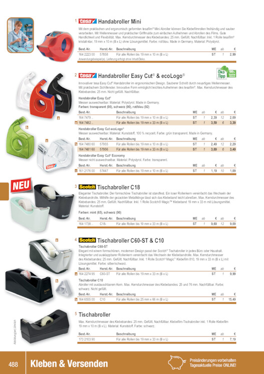 1 Handabroller Mini Mit dem praktischen und ergonomisch geformten tesafilm® Mini Abroller können Sie Klebefilmrollen freihändig und sauber verarbeiten. Mit Wellenmesser und praktischer Griffmulde zum einfachen Aufnehmen und Abrollen des Films. Gute Handlichkeit und Flexibilität. Max. Kerndurchmesser des Klebebandes: 25 mm. Gefüllt. Nachfüllbar. Inkl. 1 Rolle tesafilm® kristall-klar, 19 mm x 10 m (B x L) ohne Lösungsmittel. Farbe: rot/blau. Made in Germany. Material: Polystyrol. Best.-Nr. Herst.-Nr. Beschreibung 164 2223 00 57858 Für alle Rollen bis 19 mm x 10 m (B x L) Anwendungsbeispiel(e). Lieferung erfolgt ohne Inhalt/Deko. ME ab € ST 1 2,99 2 Handabroller Easy Cut® & ecoLogo® Innovativer tesa Easy Cut® Handabroller im ergonomischen Design. Sauberer Schnitt durch neuartiges Wellenmesser. Mit praktischem Sichtfenster. Innovative Form ermöglicht leichtes Aufnehmen des tesafilm®. Max. Kerndurchmesser des Klebebandes: 25 mm. Nicht gefüllt. Nachfüllbar. Handabroller Easy Cut® Messer auswechselbar. Material: Polystyrol. Made in Germany. Farben: transparent (00), schwarz (90), rot/blau (92) Best.-Nr. Beschreibung ME ab € ab € a 164 7479 .. Für alle Rollen bis 19 mm x 10 m (B x L) ST 1 2,39 12 2,09 a 164 7482 .. Für alle Rollen bis 19 mm x 33 m (B x L) ST 1 3,59 6 3,39 b Handabroller Easy Cut ecoLogo® Messer auswechselbar. Material: Kunststoff, 100 % recycelt. Farbe: grün transparent. Made in Germany. c Best.-Nr. Herst.-Nr. Beschreibung ME ab € ab € b 164 7480 60 57955 Für alle Rollen bis 19 mm x 10 m (B x L) ST 1 2,49 12 2,29 164 7481 60 57956 Für alle Rollen bis 19 mm x 33 m (B x L) ST 1 3,69 6 3,49 Handabroller Easy Cut® Economy Messer nicht auswechselbar. Material: Polystyrol. Farbe: transparent. Best.-Nr. Herst.-Nr. Beschreibung c 161 2176 00 57447 Für alle Rollen bis 19 mm x 10 m (B x L) ME ab € ab € ST 1 1,19 10 1,09 3 Tischabroller C18 Eleganter Tischabroller. Der formschöne Tischabroller ist standfest. Ein loser Rollenkern vereinfacht das Wechseln der Klebebandrolle. Mithilfe der gezackten Metallklinge lässt sich das Klebeband leicht abreißen. Max. Kerndurchmesser des Klebebandes: 25 mm. Gefüllt. Nachfüllbar. Inkl. 1 Rolle Scotch® Magic™ Klebeband 19 mm x 33 m mit Lösungsmittel. Material: Kunststoff. Farben: mint (65), schwarz (90) Best.-Nr. 164 1738 .. Herst.-Nr. Beschreibung C18- Für alle Rollen bis 19 mm x 33 m (B x L) ME ab € ab € ST 1 9,69 12 9,09 a4 Tischabroller C60-ST & C10 Tischabroller C60-ST Elegant mit einem formschönen, modernen Design passt der Scotch® Tischabroller in jedes Büro oder Haushalt. Integrierter und ausklappbarer Rollenkern vereinfacht das Wechseln der Klebebandrolle. Max. Kerndurchmesser des Klebebandes: 25 mm. Gefüllt. Nachfüllbar. Inkl. 1 Rolle Scotch® Magic™ Klebefilm 810, 19 mm x 33 m (B x L) mit Lösungsmittel. Farbe: silber/schwarz. Best.-Nr. Herst.-Nr. Beschreibung ME ab € a 164 2274 95 C60-ST Für alle Rollen bis 19 mm x 33 m (B x L) ST 1 9,99 b Tischabroller C10 Abroller mit austauschbarem Kern. Max. Kerndurchmesser des Klebebandes: 25 und 76 mm. Nachfüllbar. Farbe: schwarz. Nicht gefüllt. Best.-Nr. Herst.-Nr. Beschreibung ME ab € b 164 6555 00 C10 Für alle Rollen bis 25 mm x 66 m (B x L) ST 1 15,49 5 Tischabroller Max. Kerndurchmesser des Klebebandes: 25 mm. Gefüllt. Nachfüllbar. Klebefilm-Tischabroller inkl. 1 Rolle Klebefilm 19 mm x 10 m (B x L). Material: Kunststoff. Farbe: schwarz. Best.-Nr. 173 2103 90 Beschreibung Für alle Rollen bis 19 mm x 33 m (B x L) ME ab € ST 1 7,19 Abbildung(en) ähnlich 488 Kleben & Versenden Preisänderungen vorbehalten Tagesaktuelle Preise ONLINE! 164748292 164227495 164747992 173210390 164173865 164222300 164655500 164173890 161217600 164748060 164747900 164747990 164748290 164748160 164748200