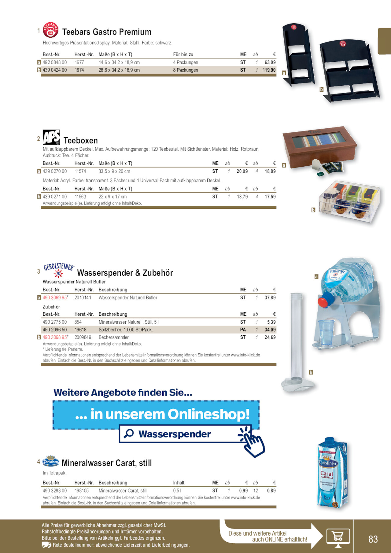 1 Teebars Gastro Premium Hochwertiges Präsentationsdisplay. Material: Stahl. Farbe: schwarz. Best.-Nr. a 492 0848 00 b 439 0424 00 Herst.-Nr. Maße (B x H x T) 1677 14,6 x 34,2 x 18,9 cm 1674 28,6 x 34,2 x 18,9 cm Für bis zu 4 Packungen 8 Packungen ME ab € ST 1 63,09 ST 1 119,90 a b 2 Teeboxen Mit aufklappbarem Deckel. Max. Aufbewahrungsmenge: 120 Teebeutel. Mit Sichtfenster. Material: Holz. Rotbraun. Aufdruck: Tee. 4 Fächer. Best.-Nr. Herst.-Nr. Maße (B x H x T) ME ab € ab a 439 0270 00 11574 33,5 x 9 x 20 cm ST 1 20,09 4 € 18,89 Material: Acryl. Farbe: transparent. 3 Fächer und 1 Universal-Fach mit aufklappbarem Deckel. Best.-Nr. Herst.-Nr. Maße (B x H x T) ME ab b 439 0271 00 11563 22 x 9 x 17 cm Anwendungsbeispiel(e). Lieferung erfolgt ohne Inhalt/Deko. ST 1 € ab 18,79 4 € 17,59 a b 3 Wasserspender & Zubehör Wasserspender Naturell Butler Best.-Nr. Herst.-Nr. Beschreibung a 490 3069 95* 2010141 Wasserspender Naturell Butler ME ab € ST 1 37,89 Zubehör Best.-Nr. Herst.-Nr. Beschreibung ME ab 490 2775 00 854 Mineralwasser Naturell, Still, 5 l ST 1 450 2096 50 19618 Spitzbecher, 1.000 St./Pack. PA 1 b 490 3068 95* 2009849 Bechersammler ST 1 Anwendungsbeispiel(e). Lieferung erfolgt ohne Inhalt/Deko. * Lieferung frei Parterre. Verpflichtende Informationen entsprechend der Lebensmittelinformationsverordnung können Sie kostenfrei unter www.info-klick.de abrufen. Einfach die Best.-Nr. in den Suchschlitz eingeben und Detailinformationen abrufen. € 5,39 34,09 24,69 Weitere Angebote finden Sie... ... in unserem Onlineshop! Wasserspender a b 4 Mineralwasser Carat, still Im Tetrapak. Best.-Nr. Herst.-Nr. Beschreibung Inhalt ME ab € ab 490 3283 00 198105 Mineralwasser Carat, still 0,5 l ST 1 0,99 12 Verpflichtende Informationen entsprechend der Lebensmittelinformationsverordnung können Sie kostenfrei unter www.info-klick.de abrufen. Einfach die Best.-Nr. in den Suchschlitz eingeben und Detailinformationen abrufen. € 0,89 Alle Preise für gewerbliche Abnehmer zzgl. gesetzlicher MwSt. Rohstoffbedingte Preisänderungen und Irrtümer vorbehalten. Bitte bei der Bestellung von Artikeln ggf. Farbcodes ergänzen. Rote Bestellnummer: abweichende Lieferzeit und Lieferbedingungen. Diese und weitere Artikel auch ONLINE erhältlich! 83 490328300 450209650 490306895 439027100 439042400 490306995 490277500 492084800 439027000