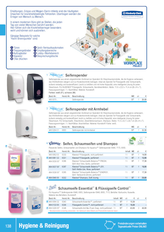 Erkältungen, Grippe und Magen-Darm-Infekte sind die häufigsten Ursachen für krankheitsbedingte Fehlzeiten. Übertragen werden die Erreger von Mensch zu Mensch. In einem modernen Büro gibt es Stellen, die jeden Tag von vielen Menschen berührt werden. Hier fühlen sich die Krankheitserreger besonders wohl und können sich ausbreiten. Gängige Beispiele für solche “Keim-Brennpunkte” sind: ᕡ Türen ᕢ Treppengeländer ᕣ Aufzugtaster ᕤ Kopierer ᕥ (Tee-)Küchen ᕦ Geld-/Verkaufsautomaten ᕧ Empfangsbereiche ᕨ Lobby-/Wartebereich ᕩ Besprechungstische a b ab 1 Seifenspender Seifenspender aus einem abgestimmten Sortiment an Spendern für Waschraumprodukte, die die Hygiene verbessern, das Wohlbefinden steigern und zur Kostenkontrolle beitragen. Ideal als Spender für Flüssigseife oder Schaumseife, äußerst vielseitig und kosteneffizient. Leicht zu befüllen und mit hoher Kapazität, eine intelligente Lösung für jeden Waschraum. Für KLEENEX® Flüssigseife, Schaumseife, Handdesinfektion. Maße: 11,6 x 23,5 x 11,4 cm (B x H x T). Fassungsvermögen: 1 l. Nachfüllbar. Material: Kunststoff. Farben: weiß (01), schwarz (90) Best.-Nr. Herst.-Nr. Beschreibung ME ab € 449 0070 .. Seifenspender ST 1 28,69 3 Seifenspender mit Armhebel Seifenspender aus einem abgestimmten Sortiment an Spendern für Waschraumprodukte, die die Hygiene verbessern, das Wohlbefinden steigern und zur Kostenkontrolle beitragen. Ideal als Spender für Flüssigseife oder Schaumseife, äußerst vielseitig und kosteneffizient: leicht zu befüllen und mit hoher Kapazität, eine intelligente Lösung für jeden Waschraum. Für Schaumseife, Waschlotion, Desinfektionsschaum, Shampoo. Maße: 11,5 x 23,7 x 24,7 cm (B x H x T). Fassungsvermögen: 1 l. Nachfüllbar. Abschließbar. Material: Kunststoff. Farbe: weiß. Best.-Nr. Herst.-Nr. Beschreibung ME ab € 449 0204 01 6955 Seifenspender mit Armhebel ST 1 33,59 * 4 Seifen, Schaumseifen und Shampoo Passende Seifen, Schaumseifen und Shampoo für Aquarius™ Seifenspender 6948, 7173, 6955. Best.-Nr. Herst.-Nr. Beschreibung Inhalt ME ab € 449 0062 03 6333 Kleenex® Flüssigseife, nicht parfümiert 1 l ST 1 14,89 a 449 0061 32 6331 Kleenex® Flüssigseife, parfümiert 1 l ST 1 12,89 494 0039 00* 6386 494 0037 00* 6387 494 0038 00* 6385 b 494 0040 00 6332 Kleenex® Schaumseife Botanics™ FRESH, Duft: Aloe Vera, Gurke, parfümiert Kleenex® Schaumseife Botanics™ JOY, Duft: Weiße Lilie, Rose, parfümiert Kleenex® Schaumseife Botanics™ ENERGY, Duft: Teebaumöl Zitrone, parfümiert Kleenex® Shampoo, Duft: blumig 1 l ST 1 17,39 1 l ST 1 16,89 1 l ST 1 17,39 1 l ST 1 29,69 5 Schaumseife Essential™ & Flüssigseife Control™ Für Aquarius™ Seifenspender 6948, 6955, Seifenspender 6948, 6955, 7173. Behälter: Kartusche, Kassette. Material des Behälters: Kunststoff. Best.-Nr. Herst.-Nr. Beschreibung Inhalt ME ab € ab a 449 0094 32 6340 Schaumseife Essential™, parfümiert 1 l ST 1 15,39 - 494 0122 00 6336 Flüssigseife Control™, nicht parfümiert 1 l ST b 494 0229 00* 6348 Schaumseife Anti Bac Foam Soap, nicht parfümiert 1 l ST * Biozidprodukte vorsichtig verwenden. Vor Gebrauch stets Etikett und Produktinformationen lesen. 1 19,39 1 43,09 3 € 40,89 138 Hygiene & Reinigung Preisänderungen vorbehalten Tagesaktuelle Preise ONLINE! 449007001 449020401 494003900 494003700 449007090 449009432 494012200 494022900