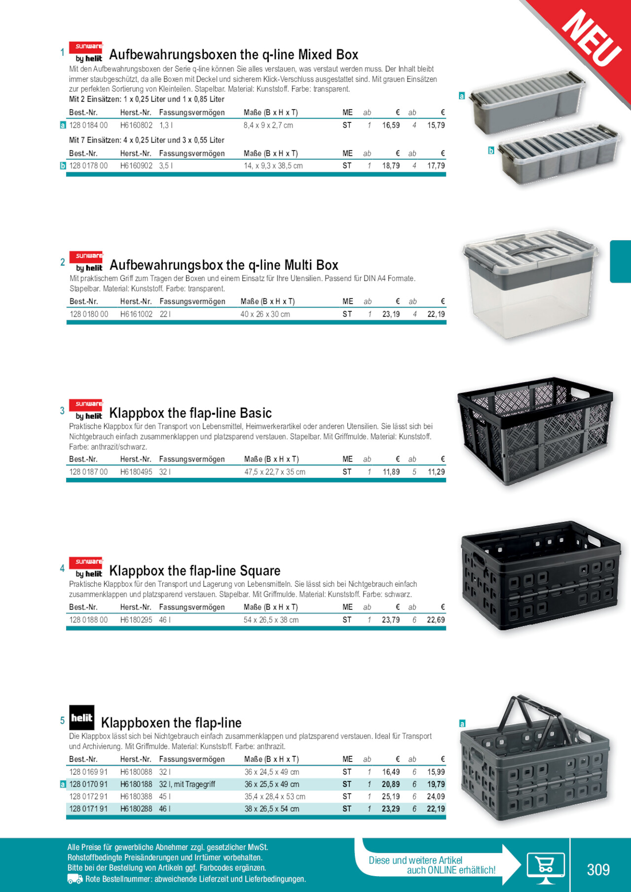 1 Aufbewahrungsboxen the q-line Mixed Box Mit den Aufbewahrungsboxen der Serie q-line können Sie alles verstauen, was verstaut werden muss. Der Inhalt bleibt immer staubgeschützt, da alle Boxen mit Deckel und sicherem Klick-Verschluss ausgestattet sind. Mit grauen Einsätzen zur perfekten Sortierung von Kleinteilen. Stapelbar. Material: Kunststoff. Farbe: transparent. Mit 2 Einsätzen: 1 x 0,25 Liter und 1 x 0,85 Liter Best.-Nr. Herst.-Nr. Fassungsvermögen Maße (B x H x T) ME ab € ab € a 128 0184 00 H6160802 1,3 l 8,4 x 9 x 2,7 cm ST 1 16,59 4 15,79 Mit 7 Einsätzen: 4 x 0,25 Liter und 3 x 0,55 Liter Best.-Nr. Herst.-Nr. Fassungsvermögen b 128 0178 00 H6160902 3,5 l Maße (B x H x T) 14, x 9,3 x 38,5 cm ME ab € ab € ST 1 18,79 4 17,79 a b 2 Aufbewahrungsbox the q-line Multi Box Mit praktischem Griff zum Tragen der Boxen und einem Einsatz für Ihre Utensilien. Passend für DIN A4 Formate. Stapelbar. Material: Kunststoff. Farbe: transparent. Best.-Nr. Herst.-Nr. Fassungsvermögen Maße (B x H x T) ME ab € ab 128 0180 00 H6161002 22 l 40 x 26 x 30 cm ST 1 23,19 4 € 22,19 3 Klappbox the flap-line Basic Praktische Klappbox für den Transport von Lebensmittel, Heimwerkerartikel oder anderen Utensilien. Sie lässt sich bei Nichtgebrauch einfach zusammenklappen und platzsparend verstauen. Stapelbar. Mit Griffmulde. Material: Kunststoff. Farbe: anthrazit/schwarz. Best.-Nr. Herst.-Nr. Fassungsvermögen Maße (B x H x T) ME ab € ab € 128 0187 00 H6180495 32 l 47,5 x 22,7 x 35 cm ST 1 11,89 5 11,29 4 Klappbox the flap-line Square Praktische Klappbox für den Transport und Lagerung von Lebensmitteln. Sie lässt sich bei Nichtgebrauch einfach zusammenklappen und platzsparend verstauen. Stapelbar. Mit Griffmulde. Material: Kunststoff. Farbe: schwarz. Best.-Nr. Herst.-Nr. Fassungsvermögen Maße (B x H x T) ME ab € ab 128 0188 00 H6180295 46 l 54 x 26,5 x 38 cm ST 1 23,79 6 € 22,69 5 Klappboxen the flap-line Die Klappbox lässt sich bei Nichtgebrauch einfach zusammenklappen und platzsparend verstauen. Ideal für Transport und Archivierung. Mit Griffmulde. Material: Kunststoff. Farbe: anthrazit. Best.-Nr. Herst.-Nr. Fassungsvermögen Maße (B x H x T) ME ab € ab € 128 0169 91 H6180088 32 l 36 x 24,5 x 49 cm ST 1 16,49 6 15,99 a 128 0170 91 H6180188 32 l, mit Tragegriff 36 x 25,5 x 49 cm ST 1 20,89 6 19,79 128 0172 91 H6180388 45 l 35,4 x 28,4 x 53 cm ST 1 25,19 6 24,09 128 0171 91 H6180288 46 l 38 x 26,5 x 54 cm ST 1 23,29 6 22,19 a Alle Preise für gewerbliche Abnehmer zzgl. gesetzlicher MwSt. Rohstoffbedingte Preisänderungen und Irrtümer vorbehalten. Bitte bei der Bestellung von Artikeln ggf. Farbcodes ergänzen. Rote Bestellnummer: abweichende Lieferzeit und Lieferbedingungen. Diese und weitere Artikel auch ONLINE erhältlich! 309 128017800 128018000 128017091 128018700 128016991 128017191 128017291 128018400 128018800