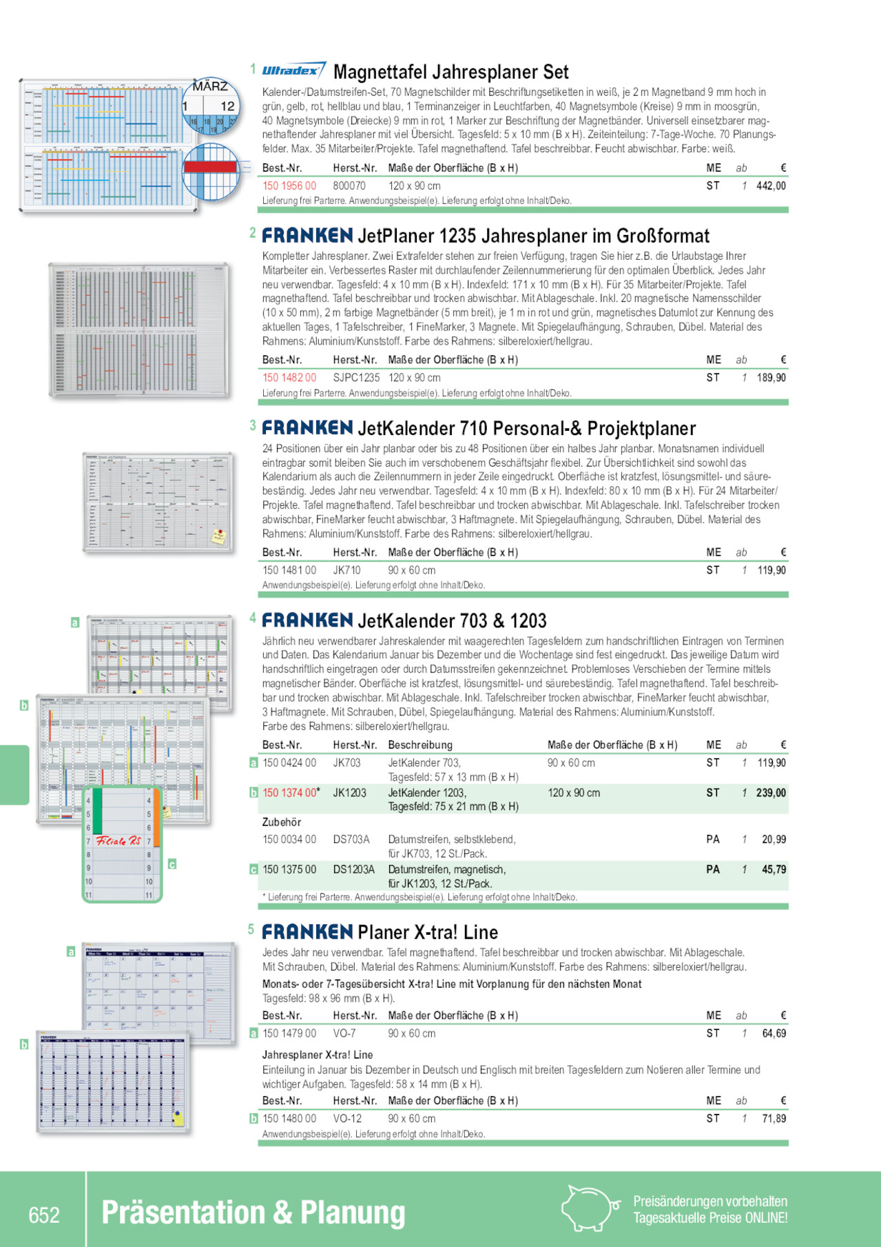a b a b 1 Magnettafel Jahresplaner Set Kalender-/Datumstreifen-Set, 70 Magnetschilder mit Beschriftungsetiketten in weiß, je 2 m Magnetband 9 mm hoch in grün, gelb, rot, hellblau und blau, 1 Terminanzeiger in Leuchtfarben, 40 Magnetsymbole (Kreise) 9 mm in moosgrün, 40 Magnetsymbole (Dreiecke) 9 mm in rot, 1 Marker zur Beschriftung der Magnetbänder. Universell einsetzbarer magnethaftender Jahresplaner mit viel Übersicht. Tagesfeld: 5 x 10 mm (B x H). Zeiteinteilung: 7-Tage-Woche. 70 Planungsfelder. Max. 35 Mitarbeiter/Projekte. Tafel magnethaftend. Tafel beschreibbar. Feucht abwischbar. Farbe: weiß. Best.-Nr. Herst.-Nr. Maße der Oberfläche (B x H) ME ab € 150 1956 00 800070 120 x 90 cm Lieferung frei Parterre. Anwendungsbeispiel(e). Lieferung erfolgt ohne Inhalt/Deko. ST 1 442,00 2 JetPlaner 1235 Jahresplaner im Großformat Kompletter Jahresplaner. Zwei Extrafelder stehen zur freien Verfügung, tragen Sie hier z.B. die Urlaubstage Ihrer Mitarbeiter ein. Verbessertes Raster mit durchlaufender Zeilennummerierung für den optimalen Überblick. Jedes Jahr neu verwendbar. Tagesfeld: 4 x 10 mm (B x H). Indexfeld: 171 x 10 mm (B x H). Für 35 Mitarbeiter/Projekte. Tafel magnethaftend. Tafel beschreibbar und trocken abwischbar. Mit Ablageschale. Inkl. 20 magnetische Namensschilder (10 x 50 mm), 2 m farbige Magnetbänder (5 mm breit), je 1 m in rot und grün, magnetisches Datumlot zur Kennung des aktuellen Tages, 1 Tafelschreiber, 1 FineMarker, 3 Magnete. Mit Spiegelaufhängung, Schrauben, Dübel. Material des Rahmens: Aluminium/Kunststoff. Farbe des Rahmens: silbereloxiert/hellgrau. Best.-Nr. Herst.-Nr. Maße der Oberfläche (B x H) ME ab € 150 1482 00 SJPC1235 120 x 90 cm Lieferung frei Parterre. Anwendungsbeispiel(e). Lieferung erfolgt ohne Inhalt/Deko. ST 1 189,90 3 JetKalender 710 Personal-& Projektplaner 24 Positionen über ein Jahr planbar oder bis zu 48 Positionen über ein halbes Jahr planbar. Monatsnamen individuell eintragbar somit bleiben Sie auch im verschobenem Geschäftsjahr flexibel. Zur Übersichtlichkeit sind sowohl das Kalendarium als auch die Zeilennummern in jeder Zeile eingedruckt. Oberfläche ist kratzfest, lösungsmittel- und säurebeständig. Jedes Jahr neu verwendbar. Tagesfeld: 4 x 10 mm (B x H). Indexfeld: 80 x 10 mm (B x H). Für 24 Mitarbeiter/ Projekte. Tafel magnethaftend. Tafel beschreibbar und trocken abwischbar. Mit Ablageschale. Inkl. Tafelschreiber trocken abwischbar, FineMarker feucht abwischbar, 3 Haftmagnete. Mit Spiegelaufhängung, Schrauben, Dübel. Material des Rahmens: Aluminium/Kunststoff. Farbe des Rahmens: silbereloxiert/hellgrau. Best.-Nr. Herst.-Nr. Maße der Oberfläche (B x H) ME ab € 150 1481 00 JK710 90 x 60 cm Anwendungsbeispiel(e). Lieferung erfolgt ohne Inhalt/Deko. ST 1 119,90 4 JetKalender 703 & 1203 Jährlich neu verwendbarer Jahreskalender mit waagerechten Tagesfeldern zum handschriftlichen Eintragen von Terminen und Daten. Das Kalendarium Januar bis Dezember und die Wochentage sind fest eingedruckt. Das jeweilige Datum wird handschriftlich eingetragen oder durch Datumsstreifen gekennzeichnet. Problemloses Verschieben der Termine mittels magnetischer Bänder. Oberfläche ist kratzfest, lösungsmittel- und säurebeständig. Tafel magnethaftend. Tafel beschreibbar und trocken abwischbar. Mit Ablageschale. Inkl. Tafelschreiber trocken abwischbar, FineMarker feucht abwischbar, 3 Haftmagnete. Mit Schrauben, Dübel, Spiegelaufhängung. Material des Rahmens: Aluminium/Kunststoff. Farbe des Rahmens: silbereloxiert/hellgrau. Best.-Nr. Herst.-Nr. Beschreibung Maße der Oberfläche (B x H) ME ab € a 150 0424 00 JK703 b 150 1374 00* JK1203 Zubehör JetKalender 703, Tagesfeld: 57 x 13 mm (B x H) JetKalender 1203, Tagesfeld: 75 x 21 mm (B x H) 90 x 60 cm 120 x 90 cm ST 1 119,90 ST 1 239,00 150 0034 00 DS703A Datumstreifen, selbstklebend, für JK703, 12 St./Pack. c c 150 1375 00 DS1203A Datumstreifen, magnetisch, für JK1203, 12 St./Pack. * Lieferung frei Parterre. Anwendungsbeispiel(e). Lieferung erfolgt ohne Inhalt/Deko. PA 1 20,99 PA 1 45,79 5 Planer X-tra! Line Jedes Jahr neu verwendbar. Tafel magnethaftend. Tafel beschreibbar und trocken abwischbar. Mit Ablageschale. Mit Schrauben, Dübel. Material des Rahmens: Aluminium/Kunststoff. Farbe des Rahmens: silbereloxiert/hellgrau. Monats- oder 7-Tagesübersicht X-tra! Line mit Vorplanung für den nächsten Monat Tagesfeld: 98 x 96 mm (B x H). Best.-Nr. Herst.-Nr. Maße der Oberfläche (B x H) ME ab a 150 1479 00 VO-7 90 x 60 cm ST 1 € 64,69 Jahresplaner X-tra! Line Einteilung in Januar bis Dezember in Deutsch und Englisch mit breiten Tagesfeldern zum Notieren aller Termine und wichtiger Aufgaben. Tagesfeld: 58 x 14 mm (B x H). Best.-Nr. Herst.-Nr. Maße der Oberfläche (B x H) ME ab € b 150 1480 00 VO-12 90 x 60 cm Anwendungsbeispiel(e). Lieferung erfolgt ohne Inhalt/Deko. ST 1 71,89 652 Präsentation & Planung Preisänderungen vorbehalten Tagesaktuelle Preise ONLINE! 150147900 150137500 150003400 150148100 150148000 150195600 150148200 150137400 150042400