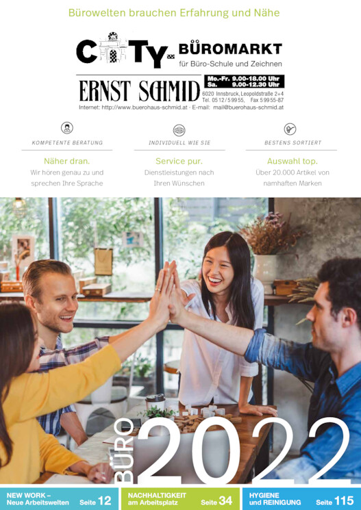 Bürowelten brauchen Erfahrung und Nähe KOMPETENTE BERATUNG Näher dran. Wir hören genau zu und sprechen Ihre Sprache INDIVIDUELL WIE SIE Service pur. Dienstleistungen nach Ihren Wünschen BESTENS SORTIERT Auswahl top. Über 20.000 Artikel von namhaften Marken BÜRO 2022 NEW WORK 12Neue Arbeitswelten Seite NACHHALTIGKEIT am Arbeitsplatz Seite 34 HYGIENE und REINIGUNG Seite 115