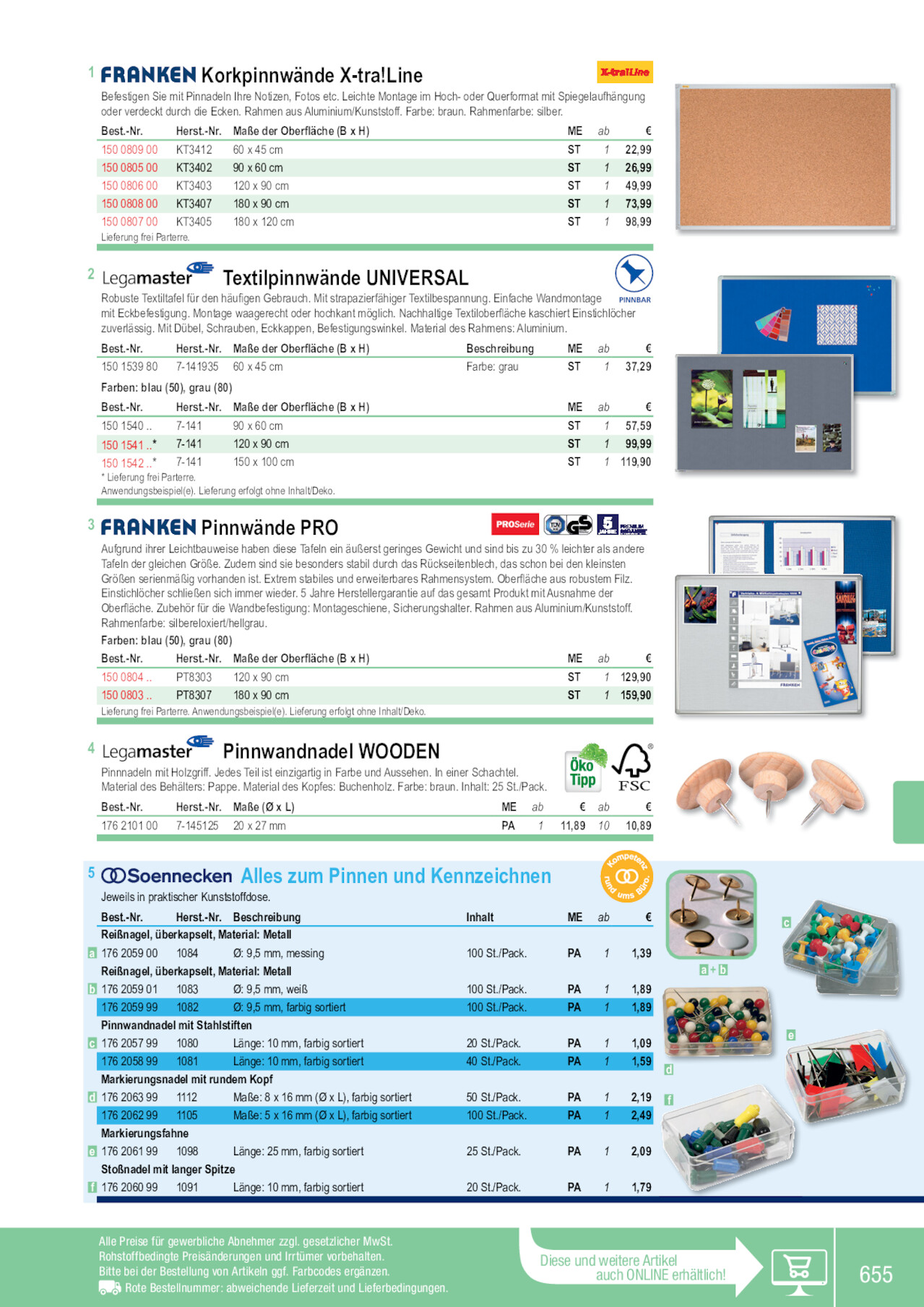 1 Korkpinnwände X-tra!Line Befestigen Sie mit Pinnadeln Ihre Notizen, Fotos etc. Leichte Montage im Hoch- oder Querformat mit Spiegelaufhängung oder verdeckt durch die Ecken. Rahmen aus Aluminium/Kunststoff. Farbe: braun. Rahmenfarbe: silber. Best.-Nr. Herst.-Nr. Maße der Oberfläche (B x H) ME ab € 150 0809 00 KT3412 60 x 45 cm ST 1 22,99 150 0805 00 KT3402 90 x 60 cm ST 1 26,99 150 0806 00 KT3403 120 x 90 cm ST 1 49,99 150 0808 00 KT3407 180 x 90 cm ST 1 73,99 150 0807 00 KT3405 Lieferung frei Parterre. 180 x 120 cm ST 1 98,99 2 Textilpinnwände UNIVERSAL Robuste Textiltafel für den häufigen Gebrauch. Mit strapazierfähiger Textilbespannung. Einfache Wandmontage mit Eckbefestigung. Montage waagerecht oder hochkant möglich. Nachhaltige Textiloberfläche kaschiert Einstichlöcher zuverlässig. Mit Dübel, Schrauben, Eckkappen, Befestigungswinkel. Material des Rahmens: Aluminium. Best.-Nr. Herst.-Nr. Maße der Oberfläche (B x H) Beschreibung ME ab € 150 1539 80 7-141935 60 x 45 cm Farbe: grau ST 1 37,29 Farben: blau (50), grau (80) Best.-Nr. Herst.-Nr. Maße der Oberfläche (B x H) ME ab € 150 1540 .. 7-141 90 x 60 cm 150 1541 ..* 7-141 120 x 90 cm 150 1542 ..* 7-141 150 x 100 cm * Lieferung frei Parterre. Anwendungsbeispiel(e). Lieferung erfolgt ohne Inhalt/Deko. ST 1 57,59 ST 1 99,99 ST 1 119,90 3 Pinnwände PRO Aufgrund ihrer Leichtbauweise haben diese Tafeln ein äußerst geringes Gewicht und sind bis zu 30 % leichter als andere Tafeln der gleichen Größe. Zudem sind sie besonders stabil durch das Rückseitenblech, das schon bei den kleinsten Größen serienmäßig vorhanden ist. Extrem stabiles und erweiterbares Rahmensystem. Oberfläche aus robustem Filz. Einstichlöcher schließen sich immer wieder. 5 Jahre Herstellergarantie auf das gesamt Produkt mit Ausnahme der Oberfläche. Zubehör für die Wandbefestigung: Montageschiene, Sicherungshalter. Rahmen aus Aluminium/Kunststoff. Rahmenfarbe: silbereloxiert/hellgrau. Farben: blau (50), grau (80) Best.-Nr. Herst.-Nr. Maße der Oberfläche (B x H) ME ab € 150 0804 .. PT8303 120 x 90 cm ST 1 129,90 150 0803 .. PT8307 180 x 90 cm Lieferung frei Parterre. Anwendungsbeispiel(e). Lieferung erfolgt ohne Inhalt/Deko. ST 1 159,90 4 Pinnwandnadel WOODEN Pinnnadeln mit Holzgriff. Jedes Teil ist einzigartig in Farbe und Aussehen. In einer Schachtel. Material des Behälters: Pappe. Material des Kopfes: Buchenholz. Farbe: braun. Inhalt: 25 St./Pack. Best.-Nr. Herst.-Nr. Maße (Ø x L) ME ab € ab 176 2101 00 7-145125 20 x 27 mm PA 1 11,89 10 € 10,89 5 Alles zum Pinnen und Kennzeichnen Jeweils in praktischer Kunststoffdose. Best.-Nr. Herst.-Nr. Beschreibung Inhalt ME ab Reißnagel, überkapselt, Material: Metall a 176 2059 00 1084 Ø: 9,5 mm, messing 100 St./Pack. PA 1 Reißnagel, überkapselt, Material: Metall b 176 2059 01 1083 Ø: 9,5 mm, weiß 100 St./Pack. PA 1 176 2059 99 1082 Ø: 9,5 mm, farbig sortiert 100 St./Pack. PA 1 Pinnwandnadel mit Stahlstiften c 176 2057 99 1080 Länge: 10 mm, farbig sortiert 20 St./Pack. PA 1 176 2058 99 1081 Länge: 10 mm, farbig sortiert 40 St./Pack. PA 1 Markierungsnadel mit rundem Kopf d 176 2063 99 1112 Maße: 8 x 16 mm (Ø x L), farbig sortiert 50 St./Pack. PA 1 176 2062 99 1105 Maße: 5 x 16 mm (Ø x L), farbig sortiert 100 St./Pack. PA 1 Markierungsfahne e 176 2061 99 1098 Länge: 25 mm, farbig sortiert 25 St./Pack. PA 1 Stoßnadel mit langer Spitze f 176 2060 99 1091 Länge: 10 mm, farbig sortiert 20 St./Pack. PA 1 € 1,39 1,89 1,89 1,09 1,59 d 2,19 f 2,49 2,09 1,79 a+b Alle Preise für gewerbliche Abnehmer zzgl. gesetzlicher MwSt. Rohstoffbedingte Preisänderungen und Irrtümer vorbehalten. Bitte bei der Bestellung von Artikeln ggf. Farbcodes ergänzen. Rote Bestellnummer: abweichende Lieferzeit und Lieferbedingungen. Diese und weitere Artikel auch ONLINE erhältlich! c e 655 150154280 176206399 150154080 176206199 176205900 150154180 176205901 176205999 150154050 150153980 176206099 176205899 176205799 150154150 150154250 176206299