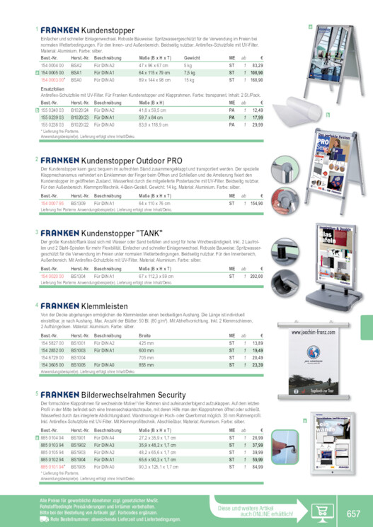1 Kundenstopper Einfacher und schneller Einlagenwechsel. Robuste Bauweise: Spritzwassergeschützt für die Verwendung im Freien bei normalen Wetterbedingungen. Für den Innen- und Außenbereich. Beidseitig nutzbar. Antireflex-Schutzfolie mit UV-Filter. Material: Aluminium. Farbe: silber. Best.-Nr. Herst.-Nr. Beschreibung Maße (B x H x T) Gewicht ME ab € 154 0004 00 BSA2 Für DIN A2 47 x 96 x 67 cm 5 kg ST 1 83,29 a 154 0005 00 BSA1 Für DIN A1 64 x 115 x 79 cm 7,5 kg ST 1 108,90 154 0003 00* BSA0 Für DIN A0 89 x 144 x 98 cm 15 kg ST 1 168,90 Ersatzfolien Antireflex-Schutzfolie mit UV-Filter. Für Franken Kundenstopper und Klapprahmen. Farbe: transparent. Inhalt: 2 St./Pack. Best.-Nr. Herst.-Nr. Beschreibung Maße (B x H) ME ab € b 155 0240 03 B1020/24 Für DIN A2 41,8 x 59,5 cm PA 1 12,49 155 0239 03 B1020/23 Für DIN A1 59,7 x 84 cm PA 1 17,99 155 0238 03 B1020/22 Für DIN A0 83,9 x 118,9 cm * Lieferung frei Parterre. Anwendungsbeispiel(e). Lieferung erfolgt ohne Inhalt/Deko. PA 1 29,99 a b 2 Kundenstopper Outdoor PRO Der Kundenstopper kann ganz bequem im aufrechten Stand zusammengeklappt und transportiert werden. Der spezielle Klappmechanismus verhindert ein Einklemmen der Finger beim Öffnen und Schließen und die Arretierung fixiert den Kundenstopper im geöffneten Zustand. Wasserfest durch die mitgelieferte Postertasche mit UV-Filter. Beidseitig nutzbar. Für den Außenbereich. Klemmprofiltechnik. 4-Bein-Gestell. Gewicht: 14 kg. Material: Aluminium. Farbe: silber. Best.-Nr. Herst.-Nr. Beschreibung Maße (B x H x T) 154 0007 95 BS1309 Für DIN A1 64 x 110 x 76 cm Lieferung frei Parterre. Anwendungsbeispiel(e). Lieferung erfolgt ohne Inhalt/Deko. ME ab € ST 1 154,90 3 Kundenstopper "TANK" Der große Kunststofftank lässt sich mit Wasser oder Sand befüllen und sorgt für hohe Windbeständigkeit. Inkl. 2 Laufrollen und 2 Stahl-Spiralen für mehr Flexibilität. Einfacher und schneller Einlagenwechsel. Robuste Bauweise: Spritzwassergeschützt für die Verwendung im Freien unter normalen Wetterbedingungen. Beidseitig nutzbar. Für den Innenbereich, Außenbereich. Mit Antireflex-Schutzfolie mit UV-Filter. Material: Aluminium. Farbe: silber. Best.-Nr. Herst.-Nr. Beschreibung Maße (B x H x T) 154 0020 00 BS1304 Für DIN A1 67 x 112,3 x 59 cm Lieferung frei Parterre. Anwendungsbeispiel(e). Lieferung erfolgt ohne Inhalt/Deko. ME ab € ST 1 202,00 4 Klemmleisten Von der Decke abgehangen ermöglichen die Klemmleisten einen beidseitigen Aushang. Die Länge ist individuell einstellbar, je nach Aushang. Max. Anzahl der Blätter: 50 Bl. (80 g/m²). Mit Abheftvorrichtung. Inkl. 2 Klemmschienen, 2 Aufhängeösen. Material: Aluminium. Farbe: silber. Best.-Nr. Herst.-Nr. Beschreibung Breite 154 5827 00 BS1001 Für DIN A2 425 mm 154 2852 00 BS1003 Für DIN A1 600 mm 154 6729 00 BS1004 705 mm 154 3605 00 BS1005 Für DIN A0 855 mm Anwendungsbeispiel(e). Lieferung erfolgt ohne Inhalt/Deko. ME ab € ST 1 13,89 ST 1 19,49 ST 1 20,49 ST 1 23,39 5 Bilderwechselrahmen Security Der formschöne Klapprahmen für wechselnde Motive! Vier Rahmen sind aufeinanderfolgend aufzuklappen. Auf dem letzten Profil in der Mitte befindet sich eine Innensechskantschraube, mit deren Hilfe man den Klapprahmen öffnet oder schließt. Wasserfest durch das integrierte Abdichtungsband. Wandmontage im Hoch- oder Querformat möglich. 35 mm Rahmenprofil. Inkl. Antireflex-Schutzfolie mit UV-Filter. Mit Klemmprofiltechnik. Abschließbar. Material: Aluminium. Farbe: silber. Best.-Nr. Herst.-Nr. Beschreibung Maße (B x H x T) a 885 0104 94 BS1901 Für DIN A4 27,2 x 35,9 x 1,7 cm 885 0103 94 BS1902 Für DIN A3 35,9 x 48,2 x 1,7 cm 885 0105 94 BS1903 Für DIN A2 48,2 x 65,6 x 1,7 cm 885 0102 94 BS1904 Für DIN A1 65,6 x 90,3 x 1,7 cm 885 0101 94* BS1905 Für DIN A0 90,3 x 125,1 x 1,7 cm * Lieferung frei Parterre. Anwendungsbeispiel(e). Lieferung erfolgt ohne Inhalt/Deko. ME ab € ST 1 28,99 ST 1 37,99 ST 1 39,99 ST 1 59,99 ST 1 84,99 a Alle Preise für gewerbliche Abnehmer zzgl. gesetzlicher MwSt. Rohstoffbedingte Preisänderungen und Irrtümer vorbehalten. Bitte bei der Bestellung von Artikeln ggf. Farbcodes ergänzen. Rote Bestellnummer: abweichende Lieferzeit und Lieferbedingungen. Diese und weitere Artikel auch ONLINE erhältlich! 657 154285200 154002000 154000500 154672900 154582700 154360500 155024003 885010294 155023803 885010394 155023903 885010494 154000795 154000300 885010194 885010594 154000400