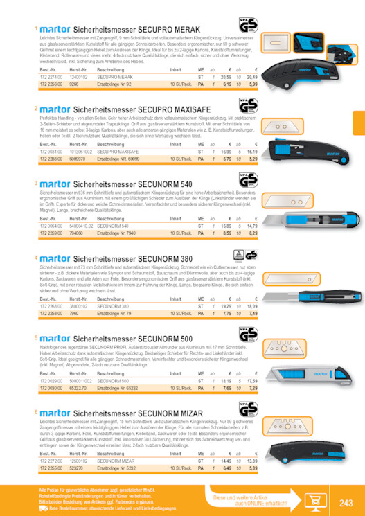 1 Sicherheitsmesser SECUPRO MERAK Leichtes Sicherheitsmesser mit Zangengriff, 9 mm Schnitttiefe und vollautomatischem Klingenrückzug. Universalmesser aus glasfaserverstärktem Kunststoff für alle gängigen Schneidarbeiten. Besonders ergonomischer, nur 59 g schwerer Griff mit einem leichtgängigen Hebel zum Auslösen der Klinge. Ideal für bis zu 2-lagige Kartons, Kunststoffumreifungen, Klebeband, Rollenware und vieles mehr. 4-fach nutzbare Qualitätsklinge, die sich einfach, sicher und ohne Werkzeug wechseln lässt. Inkl. Sicherung zum Arretieren des Hebels. Best.-Nr. Herst.-Nr. Beschreibung Inhalt ME ab € ab € 172 2274 00 12400102 SECUPRO MERAK ST 1 20,59 10 20,49 172 2256 00 9266 Ersatzklinge Nr. 92 10 St./Pack. PA 1 6,19 10 5,99 2 Sicherheitsmesser SECUPRO MAXISAFE Perfektes Handling - von allen Seiten. Sehr hoher Arbeitsschutz dank vollautomatischem Klingenrückzug. Mit praktischem 3-Seiten-Schieber und abgerundeter Trapezklinge. Griff aus glasfaserverstärktem Kunststoff. Mit einer Schnitttiefe von 16 mm meistert es selbst 3-lagige Kartons, aber auch alle anderen gängigen Materialen wie z. B. Kunststoffumreifungen, Folien oder Textil. 2-fach nutzbare Qualitätsklinge, die sich ohne Werkzeug wechseln lässt. Best.-Nr. 172 0031 00 172 2288 00 Herst.-Nr. 1013061002 6009970 Beschreibung SECUPRO MAXISAFE Ersatzklinge NR. 60099 Inhalt ME ab € ab € ST 1 16,99 5 16,19 10 St./Pack. PA 1 5,79 10 5,29 3 Sicherheitsmesser SECUNORM 540 Sicherheitsmesser mit 36 mm Schnitttiefe und automatischem Klingenrückzug für eine hohe Arbeitssicherheit. Besonders ergonomischer Griff aus Aluminium, mit einem großflächigen Schieber zum Auslösen der Klinge (Linkshänder wenden sie im Griff). Experte für dicke und weiche Schneidmaterialien. Vereinfachter und besonders sicherer Klingenwechsel (inkl. Magnet). Lange, bruchsichere Qualitätsklinge. Best.-Nr. 172 0064 00 172 2259 00 Herst.-Nr. Beschreibung 54000410.02 SECUNORM 540 794060 Ersatzklinge Nr. 7940 Inhalt ME ab € ab € ST 1 15,89 5 14,79 10 St./Pack. PA 1 8,59 10 8,29 4 Sicherheitsmesser SECUNORM 380 Sicherheitsmesser mit 73 mm Schnitttiefe und automatischem Klingenrückzug. Schneidet wie ein Cuttermesser, nur eben sicherer - z.B. dickere Materialien wie Styropor und Schaumstoff, Bauschaum und Dämmwolle, aber auch bis zu 4-lagige Kartons, Sackwaren und alle Arten von Folie. Besonders ergonomischer Griff aus glasfaserverstärktem Kunststoff (inkl. Soft-Grip), mit einer robusten Metallschiene im Innern zur Führung der Klinge. Lange, biegsame Klinge, die sich einfach, sicher und ohne Werkzeug wechseln lässt. Best.-Nr. Herst.-Nr. Beschreibung Inhalt ME ab € ab € 172 2268 00 38000102 172 2258 00 7960 SECUNORM 380 Ersatzklinge Nr. 79 ST 10 St./Pack. PA 1 19,29 10 18,09 1 7,79 10 7,49 5 Sicherheitsmesser SECUNORM 500 Nachfolger des legendären SECUNORM PROFI. Äußerst robuster Allrounder aus Aluminium mit 17 mm Schnitttiefe. Hoher Arbeitsschutz dank automatischem Klingenrückzug. Beidseitiger Schieber für Rechts- und Linkshänder inkl. Soft-Grip. Ideal geeignet für alle gängigen Schneidmaterialien. Vereinfachter und besonders sicherer Klingenwechsel (inkl. Magnet). Abgerundete, 2-fach nutzbare Qualitätsklinge. Best.-Nr. 172 0029 00 172 0030 00 Herst.-Nr. 5000011002 65232.70 Beschreibung SECUNORM 500 Ersatzklinge Nr. 65232 Inhalt ME ab € ab € ST 1 18,19 5 17,59 10 St./Pack. PA 1 7,69 10 7,29 6 Sicherheitsmesser SECUNORM MIZAR Leichtes Sicherheitsmesser mit Zangengriff, 15 mm Schnitttiefe und automatischem Klingenrückzug. Nur 59 g schweres Zangengriffmesser mit einem leichtgängigen Hebel zum Auslösen der Klinge. Für alle normalen Schneidarbeiten, z.B. durch 3-lagige Kartons, Folie, Kunststoffumreifungen, Klebeband, Sackwaren oder Textil. Besonders ergonomischer Griff aus glasfaserverstärktem Kunststoff. Inkl. innovativer 3in1-Sicherung, mit der sich das Schneidwerkzeug ver- und entriegeln sowie der Klingenwechsel einleiten lässt. 2-fach nutzbare Qualitätsklinge. Best.-Nr. Herst.-Nr. Beschreibung Inhalt ME ab € ab € 172 2272 00 12500102 SECUNORM MIZAR ST 1 14,49 10 13,89 172 2255 00 523270 Ersatzklinge Nr. 5232 10 St./Pack. PA 1 6,49 10 5,89 Alle Preise für gewerbliche Abnehmer zzgl. gesetzlicher MwSt. Rohstoffbedingte Preisänderungen und Irrtümer vorbehalten. Bitte bei der Bestellung von Artikeln ggf. Farbcodes ergänzen. Rote Bestellnummer: abweichende Lieferzeit und Lieferbedingungen. Diese und weitere Artikel auch ONLINE erhältlich! 243 172225500 172225800 172227400 172225900 172006400 172003000 172003100 172227200 172226800 172002900