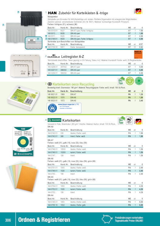 a b 1 Zubehör für Karteikästen & -tröge Stützplatten Stützplatte zum Einrasten für HAN Karteitröge und -kästen. Perfekte Organisation mit unbegrenzten Möglichkeiten. Zubehör optional: verschiebbarer Sichtreiter (Art.-Nr. 9001). Material: hochwertiger Kunststoff, Polystyrol. Farben: lichtgrau (81), schwarz (90) Best.-Nr. Herst.-Nr. Beschreibung ME ab € 148 0015 81 9027 DIN A7 quer, Farbe: lichtgrau 148 0013 .. 9026 DIN A6 quer a 148 0011 .. 9025 DIN A5 quer c b 148 0168 81 9024 DIN A4 quer, Farbe: lichtgrau Sichtreiter zum Beschriften von Stützplatten Best.-Nr. Herst.-Nr. Beschreibung ST 1 1,69 ST 1 1,99 ST 1 2,69 ST 1 4,99 ME ab €/ST c 148 0106 00 9001 Farbe: transparent ST 10 0,62 2 Leitregister A-Z Tabrückseite beschriftbar. Taben geprägt, in 5/5-Teilung. Taben: A-Z. Material: Kunststoff. Farbe: weiß. 25 Registerblätter. Best.-Nr. Herst.-Nr. Beschreibung ME ab € 145 0238 01 367002 DIN A7 quer ST 1 5,09 145 0237 01 366002 DIN A6 quer ST 1 6,09 145 0236 01 365002 DIN A5 quer ST 1 8,89 3 Karteikarten oeco Recycling Beidseitig liniert. Grammatur: 190 g/m². Material: Recyclingpapier. Farbe: weiß. Inhalt: 100 St./Pack. Best.-Nr. Herst.-Nr. Beschreibung ME ab 145 0021 01 1569 DIN A7 PA 1 145 0022 01 1570 DIN A6 PA 1 145 0023 01 1572 DIN A5 PA 1 € 1,39 1,99 3,49 4 Karteikarten Verpackt in Folie. Grammatur: 205 g/m². Holzfrei. Material: Karton. Inhalt: 100 St./Pack. DIN A8 Best.-Nr. Herst.-Nr. Beschreibung 144 0742 01 330 blanko, Farbe: weiß 144 0743 01 380 liniert, Farbe: weiß DIN A7 Farben: weiß (01), gelb (10), rosa (32), blau (50) Best.-Nr. Herst.-Nr. Beschreibung 144 0748 01 10500 blanko, Farbe: weiß 144 0746 01 10200 kariert, Farbe: weiß 144 0747 .. 108 liniert DIN A6 Farben: weiß (01), gelb (10), rosa (32), blau (50), grün (60) Best.-Nr. Herst.-Nr. Beschreibung 144 0751 01 1050 blanko, Farbe: weiß 144 0749 01 1020 kariert, Farbe: weiß 144 0750 .. 108 liniert DIN A5 Farben: weiß (01), gelb (10), rosa (32), blau (50), grün (60) Best.-Nr. Herst.-Nr. Beschreibung 144 0754 01 1050 blanko, Farbe: weiß 144 0752 01 1020 kariert, Farbe: weiß 144 0753 .. 108 liniert DIN A4 Best.-Nr. 144 0745 01 144 0755 10 Herst.-Nr. Beschreibung 1050 blanko, Farbe: weiß 1032 blanko, Farbe: gelb ME ab PA 1 PA 1 € 1,99 1,99 ME ab PA 1 PA 1 PA 1 € 1,59 1,59 1,59 ME ab PA 1 PA 1 PA 1 € 2,49 2,49 2,49 ME ab PA 1 PA 1 PA 1 € 4,39 4,39 4,39 ME ab PA 1 PA 1 € 6,69 6,69 306 Ordnen & Registrieren Preisänderungen vorbehalten Tagesaktuelle Preise ONLINE! 144074710 148001190 144074750 148016881 144075301 144075310 145023801 144074301 148001381 144075401 148001181 145023601 144075101 144075350 144074601 144075332 144074732 144075032 144075060 148001581 144075201 144075510 144075050 144074901 145023701 144074801 144075010 144075360 144074201 148010600 144074701 144075001 148001390 144074501