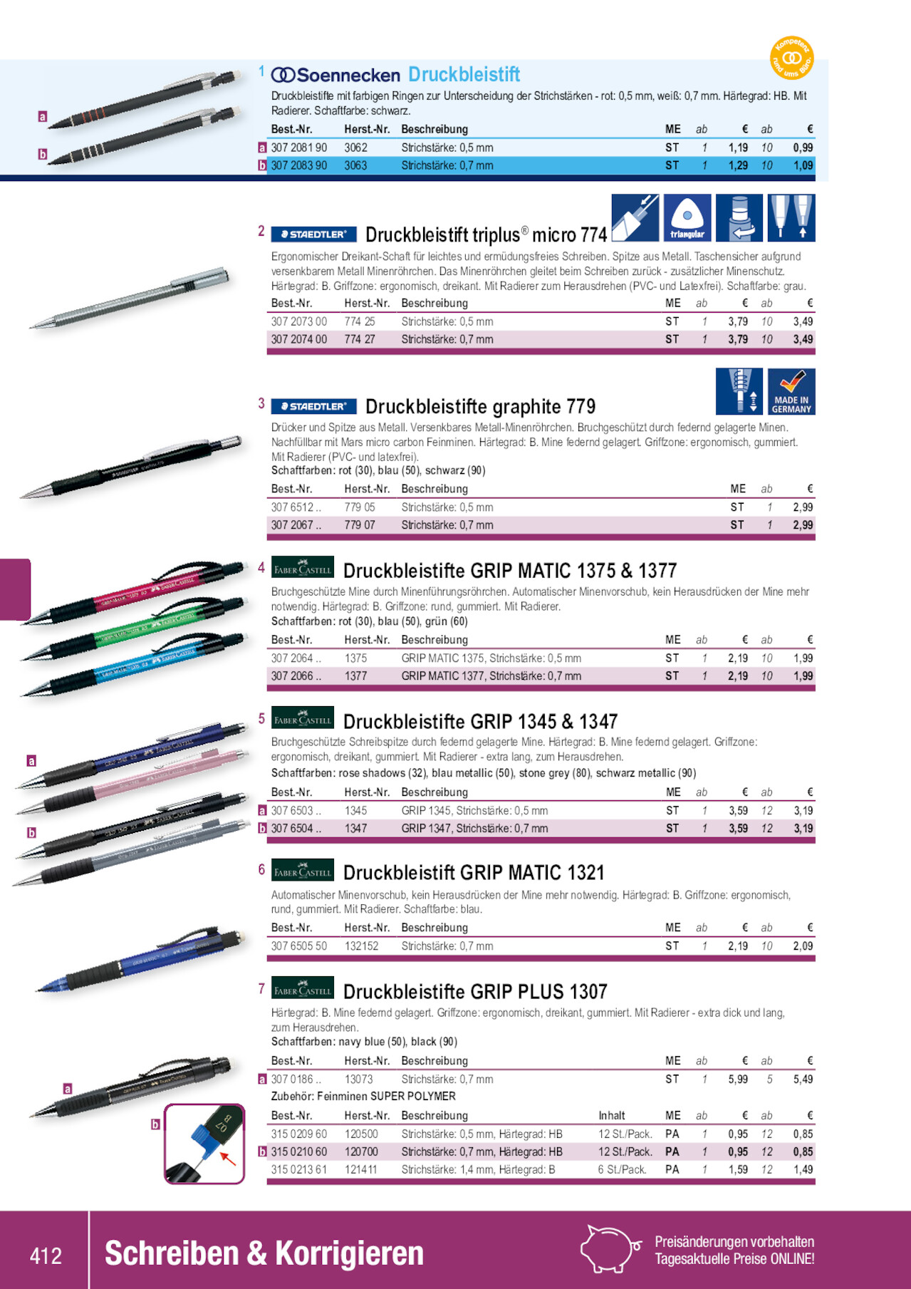 a b a b a b 1 Druckbleistift Druckbleistifte mit farbigen Ringen zur Unterscheidung der Strichstärken - rot: 0,5 mm, weiß: 0,7 mm. Härtegrad: HB. Mit Radierer. Schaftfarbe: schwarz. Best.-Nr. Herst.-Nr. Beschreibung ME ab € ab € a 307 2081 90 3062 Strichstärke: 0,5 mm ST 1 1,19 10 0,99 b 307 2083 90 3063 Strichstärke: 0,7 mm ST 1 1,29 10 1,09 2 Druckbleistift triplus® micro 774 Ergonomischer Dreikant-Schaft für leichtes und ermüdungsfreies Schreiben. Spitze aus Metall. Taschensicher aufgrund versenkbarem Metall Minenröhrchen. Das Minenröhrchen gleitet beim Schreiben zurück - zusätzlicher Minenschutz. Härtegrad: B. Griffzone: ergonomisch, dreikant. Mit Radierer zum Herausdrehen (PVC- und Latexfrei). Schaftfarbe: grau. Best.-Nr. Herst.-Nr. Beschreibung ME ab € ab € 307 2073 00 774 25 Strichstärke: 0,5 mm ST 1 3,79 10 3,49 307 2074 00 774 27 Strichstärke: 0,7 mm ST 1 3,79 10 3,49 3 Druckbleistifte graphite 779 Drücker und Spitze aus Metall. Versenkbares Metall-Minenröhrchen. Bruchgeschützt durch federnd gelagerte Minen. Nachfüllbar mit Mars micro carbon Feinminen. Härtegrad: B. Mine federnd gelagert. Griffzone: ergonomisch, gummiert. Mit Radierer (PVC- und latexfrei). Schaftfarben: rot (30), blau (50), schwarz (90) Best.-Nr. Herst.-Nr. Beschreibung ME ab € 307 6512 .. 779 05 Strichstärke: 0,5 mm ST 1 2,99 307 2067 .. 779 07 Strichstärke: 0,7 mm ST 1 2,99 4 Druckbleistifte GRIP MATIC 1375 & 1377 Bruchgeschützte Mine durch Minenführungsröhrchen. Automatischer Minenvorschub, kein Herausdrücken der Mine mehr notwendig. Härtegrad: B. Griffzone: rund, gummiert. Mit Radierer. Schaftfarben: rot (30), blau (50), grün (60) Best.-Nr. Herst.-Nr. Beschreibung ME ab € ab € 307 2064 .. 1375 GRIP MATIC 1375, Strichstärke: 0,5 mm ST 1 2,19 10 1,99 307 2066 .. 1377 GRIP MATIC 1377, Strichstärke: 0,7 mm ST 1 2,19 10 1,99 5 Druckbleistifte GRIP 1345 & 1347 Bruchgeschützte Schreibspitze durch federnd gelagerte Mine. Härtegrad: B. Mine federnd gelagert. Griffzone: ergonomisch, dreikant, gummiert. Mit Radierer - extra lang, zum Herausdrehen. Schaftfarben: rose shadows (32), blau metallic (50), stone grey (80), schwarz metallic (90) Best.-Nr. Herst.-Nr. Beschreibung ME ab € ab a 307 6503 .. 1345 GRIP 1345, Strichstärke: 0,5 mm ST 1 3,59 12 b 307 6504 .. 1347 GRIP 1347, Strichstärke: 0,7 mm ST 1 3,59 12 € 3,19 3,19 6 Druckbleistift GRIP MATIC 1321 Automatischer Minenvorschub, kein Herausdrücken der Mine mehr notwendig. Härtegrad: B. Griffzone: ergonomisch, rund, gummiert. Mit Radierer. Schaftfarbe: blau. Best.-Nr. Herst.-Nr. Beschreibung ME ab € ab € 307 6505 50 132152 Strichstärke: 0,7 mm ST 1 2,19 10 2,09 7 Druckbleistifte GRIP PLUS 1307 Härtegrad: B. Mine federnd gelagert. Griffzone: ergonomisch, dreikant, gummiert. Mit Radierer - extra dick und lang, zum Herausdrehen. Schaftfarben: navy blue (50), black (90) Best.-Nr. Herst.-Nr. Beschreibung ME ab € ab € a 307 0186 .. 13073 Strichstärke: 0,7 mm ST 1 5,99 5 5,49 Zubehör: Feinminen SUPER POLYMER Best.-Nr. Herst.-Nr. Beschreibung Inhalt ME ab € ab € 315 0209 60 120500 Strichstärke: 0,5 mm, Härtegrad: HB 12 St./Pack. PA 1 0,95 12 0,85 b 315 0210 60 120700 Strichstärke: 0,7 mm, Härtegrad: HB 12 St./Pack. PA 1 0,95 12 0,85 315 0213 61 121411 Strichstärke: 1,4 mm, Härtegrad: B 6 St./Pack. PA 1 1,59 12 1,49 412 Schreiben & Korrigieren Preisänderungen vorbehalten Tagesaktuelle Preise ONLINE! 307650332 307650350 307206660 307650490 307018650 307650480 307206650 307650450 307651250 307208390 307206630 307206790 315021060 307206430 307651230 307650432 307207400 315021361 315020960 307206450 307650390 307650380 307206460 307206750 307651290 307206730 307207300 307650550 307208190 307018690