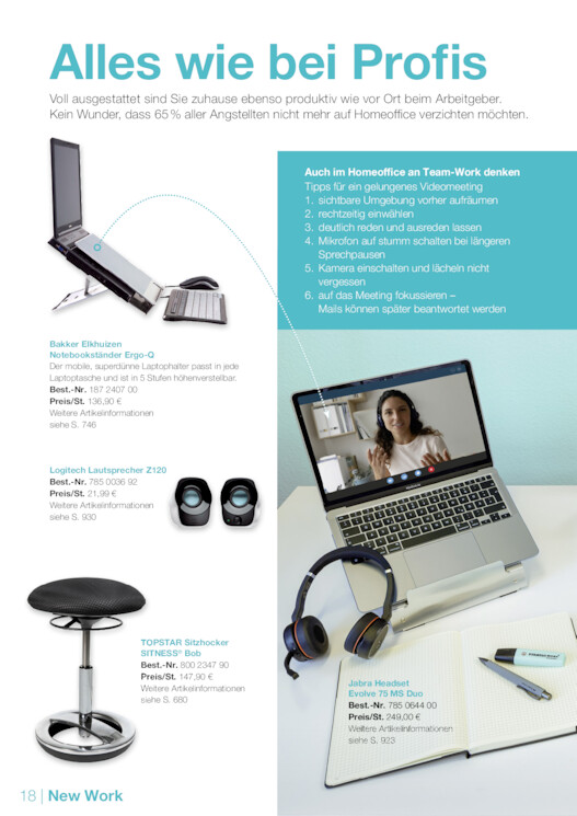 Alles wie bei Profis Voll ausgestattet sind Sie zuhause ebenso produktiv wie vor Ort beim Arbeitgeber. Kein Wunder, dass 65 % aller Angstellten nicht mehr auf Homeoffice verzichten möchten. Bakker Elkhuizen Notebookständer Ergo-Q Der mobile, superdünne Laptophalter passt in jede Laptoptasche und ist in 5 Stufen höhenverstellbar. Best.-Nr. 187 2407 00 Preis/St. 136,90 € Weitere Artikelinformationen siehe S. 746 Logitech Lautsprecher Z120 Best.-Nr. 785 0036 92 Preis/St. 21,99 € Weitere Artikelinformationen siehe S. 930 Auch im Homeoffice an Team-Work denken Tipps für ein gelungenes Videomeeting 1. sichtbare Umgebung vorher aufräumen 2. rechtzeitig einwählen 3. deutlich reden und ausreden lassen 4. Mikrofon auf stumm schalten bei längeren Sprechpausen 5. Kamera einschalten und lächeln nicht vergessen 6. auf das Meeting fokussieren – Mails können später beantwortet werden TOPSTAR Sitzhocker SITNESS® Bob Best.-Nr. 800 2347 90 Preis/St. 147,90 € Weitere Artikelinformationen siehe S. 680 18 | New Work Jabra Headset Evolve 75 MS Duo Best.-Nr. 785 0644 00 Preis/St. 249,00 € Weitere Artikelinformationen siehe S. 923