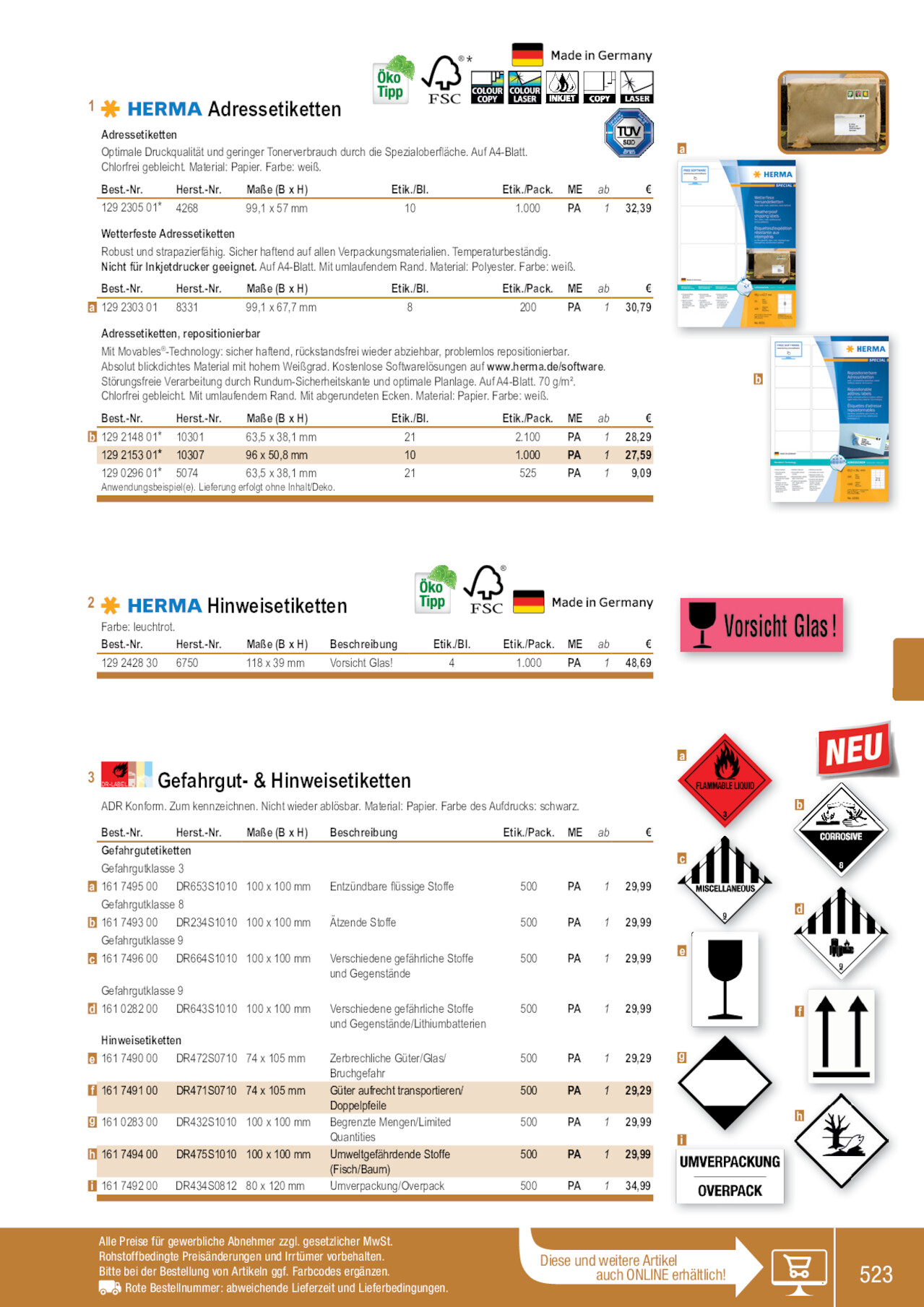 * 1 Adressetiketten InkLjaetsderrudrckuecrker Durcghelparuüfft Adressetiketten Optimale Druckqualität und geringer Tonerverbrauch durch die Spezialoberfläche. Auf A4-Blatt. Chlorfrei gebleicht. Material: Papier. Farbe: weiß. Standard IS-P-002-2 Best.-Nr. Herst.-Nr. 129 2305 01* 4268 Maße (B x H) 99,1 x 57 mm Etik./Bl. 10 Etik./Pack. ME ab € 1.000 PA 1 32,39 Wetterfeste Adressetiketten Robust und strapazierfähig. Sicher haftend auf allen Verpackungsmaterialien. Temperaturbeständig. Nicht für Inkjetdrucker geeignet. Auf A4-Blatt. Mit umlaufendem Rand. Material: Polyester. Farbe: weiß. Best.-Nr. Herst.-Nr. a 129 2303 01 8331 Maße (B x H) 99,1 x 67,7 mm Etik./Bl. 8 Etik./Pack. ME ab € 200 PA 1 30,79 Adressetiketten, repositionierbar Mit Movables®-Technology: sicher haftend, rückstandsfrei wieder abziehbar, problemlos repositionierbar. Absolut blickdichtes Material mit hohem Weißgrad. Kostenlose Softwarelösungen auf www.herma.de/software. Störungsfreie Verarbeitung durch Rundum-Sicherheitskante und optimale Planlage. Auf A4-Blatt. 70 g/m². Chlorfrei gebleicht. Mit umlaufendem Rand. Mit abgerundeten Ecken. Material: Papier. Farbe: weiß. Best.-Nr. Herst.-Nr. Maße (B x H) b 129 2148 01* 10301 63,5 x 38,1 mm 129 2153 01* 10307 96 x 50,8 mm 129 0296 01* 5074 63,5 x 38,1 mm Anwendungsbeispiel(e). Lieferung erfolgt ohne Inhalt/Deko. Etik./Bl. 21 10 21 Etik./Pack. ME ab 2.100 PA 1 1.000 PA 1 525 PA 1 € 28,29 27,59 9,09 a b 2 Hinweisetiketten Farbe: leuchtrot. Best.-Nr. Herst.-Nr. Maße (B x H) Beschreibung 129 2428 30 6750 118 x 39 mm Vorsicht Glas! Etik./Bl. 4 Etik./Pack. ME ab € 1.000 PA 1 48,69 3 DR-LABEL Gefahrgut- & Hinweisetiketten ADR Konform. Zum kennzeichnen. Nicht wieder ablösbar. Material: Papier. Farbe des Aufdrucks: schwarz. Best.-Nr. Herst.-Nr. Maße (B x H) Gefahrgutetiketten Gefahrgutklasse 3 a 161 7495 00 DR653S1010 100 x 100 mm Gefahrgutklasse 8 b 161 7493 00 DR234S1010 100 x 100 mm Gefahrgutklasse 9 c 161 7496 00 DR664S1010 100 x 100 mm Gefahrgutklasse 9 d 161 0282 00 DR643S1010 100 x 100 mm Hinweisetiketten e 161 7490 00 DR472S0710 74 x 105 mm f 161 7491 00 DR471S0710 74 x 105 mm g 161 0283 00 DR432S1010 100 x 100 mm h 161 7494 00 DR475S1010 100 x 100 mm i 161 7492 00 DR434S0812 80 x 120 mm Beschreibung Entzündbare flüssige Stoffe Ätzende Stoffe Verschiedene gefährliche Stoffe und Gegenstände Verschiedene gefährliche Stoffe und Gegenstände/Lithiumbatterien Zerbrechliche Güter/Glas/ Bruchgefahr Güter aufrecht transportieren/ Doppelpfeile Begrenzte Mengen/Limited Quantities Umweltgefährdende Stoffe (Fisch/Baum) Umverpackung/Overpack Etik./Pack. ME ab € 500 PA 1 29,99 500 PA 1 29,99 500 PA 1 29,99 500 PA 1 29,99 500 PA 1 29,29 500 PA 1 29,29 500 PA 1 29,99 500 PA 1 29,99 500 PA 1 34,99 a c e g i Alle Preise für gewerbliche Abnehmer zzgl. gesetzlicher MwSt. Rohstoffbedingte Preisänderungen und Irrtümer vorbehalten. Bitte bei der Bestellung von Artikeln ggf. Farbcodes ergänzen. Rote Bestellnummer: abweichende Lieferzeit und Lieferbedingungen. Diese und weitere Artikel auch ONLINE erhältlich! b d f h 523
