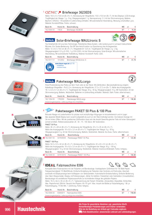 1 Briefwaage 3623EDS Maße: 19,5 x 4 x 15,8 cm (B x H x T). Abmessung der Wiegefläche: 15,8 x 15,8 cm (B x T). Art des Displays: LCD-Anzeige. Tragfähigkeit der Waage: 1 g - 5 kg. Wiegegenauigkeit: 1 g. Nennspannung: 3 V. Art der Stromversorgung: Batterie. Bauform: CR2032. 1 Knopfzelle im Lieferumfang enthalten. Mit automatischer Abschaltung. Messung umschaltbar: g/oz. Material: Kunststoff/Glas. Farbe: schwarz. Best.-Nr. Herst.-Nr. Beschreibung 162 0004 00 11834 Briefwaage 3623EDS ME ab € ST 1 16,39 2 Solar-Briefwaage MAULtronic S Top Solartechnik mit Low-Asic-Technologie. Patentiertes Mess-System, volle Leistung auch in schwach beleuchteten Räumen. Ein-Tasten-Bedienung: On-Off-Tare-Hold-Funktion zur Speicherung des Anzeigewertes. Maße: 13 x 6,5 x 19,6 cm (B x H x T). Wiegeteller Ø: 12,8 cm. Tragfähigkeit der Waage: 2 g - 2 kg. Wiegegenauigkeit: 0,5 g (0-100), 1 g (100-2.000). Art der Stromversorgung: Solar-Energie. Mit automatischer Abschaltung. Mit automatischer Nullstellung. Material: Kunststoff. Farbe: weiß. Best.-Nr. Herst.-Nr. Beschreibung ME ab € 162 0017 01 1512002 Briefwaage MAULtronic S ST 1 61,79 a b 3 Paketwaage MAULcargo Freie Positionierung des Pultes auf dem Tisch oder an der Wand. Mit Zählfunktion. Benutzerkalibrierung möglich. Kabellänge Wiegeteller - Pult 2,2 m. Abmessung der Wiegefläche: 27,3 x 27,3 cm (B x T). Maße des Anzeigegeräts: 18,1 x 3,8 x 9,1 cm (B x H x T). Tragfähigkeit der Waage: 40 g - 50 kg. Wiegegenauigkeit: 10 g. Mit Tarafunktion. Art der Stromversorgung: Batterie, Netzbetrieb. Batterien im Lieferumfang enthalten. Material: Stahl. Farbe: silber/schwarz. Best.-Nr. Herst.-Nr. Beschreibung 162 1054 95 1795009 Paketwaage MAULcargo Anwendungsbeispiel(e). Lieferung erfolgt ohne Inhalt/Deko. ME ab € ST 1 150,90 4 Paketwaagen PAKET 50 Plus & 100 Plus Robuste Waage mit Justierfunktion für präzise nicht eichpflichtige Wägungen im Industriebereich und im Lager. Das separate Metall-Display kann sowohl aufgestellt als auch an der Wand befestigt werden. Gut lesbare Anzeige mit 34 mm hohen Ziffern. Mit der praktischen Zählfunktion lässt sich die Anzahl Gewichts-gleicher Teile mit hoher Genauigkeit schnell ermitteln. Referenzstückzahlen 25 - 50 - 75 - 100 Stück. Mit Tarafunktion. PAKET 50 Plus Maße: 36 x 5 x 28 cm (B x H x T). Abmessung der Wiegefläche: 25 x 5 x 25 cm (B x H x T). Maße des Anzeigegeräts: 18 x 9,5 x 3,5 cm (B x H x T). Tragfähigkeit der Waage: 5 g - 50 kg. Wiegegenauigkeit: 5 g. Art der Stromversorgung: Batterie, Netzbetrieb. Material: Alu-Guss. Farbe: silber/schwarz. Best.-Nr. Herst.-Nr. Beschreibung ME ab € a 162 0007 00 507605005 Paketwaage PAKET 50 Plus ST 1 123,90 PAKET 100 Plus Maße: 52,5 x 5,5 x 42 cm (B x H x T). Abmessung der Wiegefläche: 40 x 40 x 5,5 cm (B x H x T). Maße des Anzeigegeräts: 18 x 9,5 x 3,5 cm (B x H x T). Tragfähigkeit der Waage: 50 g - 100 kg. Wiegegenauigkeit: 10 g. Art der Stromversorgung: Netzbetrieb. Material: Aluminium/Edelstahl. Farbe: lichtgrau. Best.-Nr. Herst.-Nr. Beschreibung ME ab € b 162 0008 00 507610010 Paketwaage PAKET 100 Plus ST 1 164,90 996 5 Falzmaschine 8306 Kompakte Büro-Falzmaschine mit vier Falzarten und Bandauslage. Ausklappbarer Zuführtisch für 150 Blatt Papier. Falzgeschwindigkeit 115 Blatt/Minute. Einfache Einstellung der Falzarten über Symbole und Farbcodes. Abschaltautomatik mit Displayanzeige beim Aufklappen von Gehäuseteilen. Automatische-Endabschaltung. Einfache Bedienung über Start-/Stoppschalter. Display mit Fehleranzeigen. Zähler für Addition (Totalzähler) oder Subtraktion (Vorwahlzähler). Bandauslage mit verstellbarer Papierauswurfrolle zur kontrollierten Ablage des gefalzten Papiers. Maße: 74,5 x 42,2 x 36 cm (B x H x T). Typbezeichnung der Falzart: Wickelfalz, Zickzackfalz, Doppelfalz, Einfachfalz. Max. Papierformat: DIN A4. Gewicht des Papiers: 60-115 g/m². Max. Anzahl der Blätter je Falzarbeitsgang: 1 Bl. je Falzarbeitsgang. 115 Bl./Min. 1 Zuführung. Farbe: hellgrau. Best.-Nr. Herst.-Nr. Beschreibung 162 0006 00 83060011 Falzmaschine 8306 Anwendungsbeispiel(e). Lieferung erfolgt ohne Inhalt/Deko. ME ab € ST 1 749,00 Haustechnik Alle Preise für gewerbliche Abnehmer zzgl. gesetzlicher MwSt. Rohstoffbedingte Preisänderungen und PIrrrteüimsäenr dvoerrbuenhgaletennv. orbehalten Bitte bei der Bestellung von Artikeln ggfT. aFgarebscaokdetuseelrlegäPnzreenis.e ONLINE! Rote Bestellnummer: abweichende Lieferzeit und Lieferbedingungen.