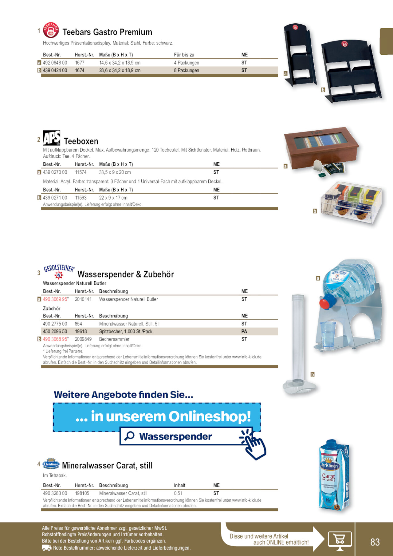 1 Teebars Gastro Premium Hochwertiges Präsentationsdisplay. Material: Stahl. Farbe: schwarz. Best.-Nr. a 492 0848 00 b 439 0424 00 Herst.-Nr. Maße (B x H x T) 1677 14,6 x 34,2 x 18,9 cm 1674 28,6 x 34,2 x 18,9 cm Für bis zu 4 Packungen 8 Packungen ME ST ST a b 2 Teeboxen Mit aufklappbarem Deckel. Max. Aufbewahrungsmenge: 120 Teebeutel. Mit Sichtfenster. Material: Holz. Rotbraun. Aufdruck: Tee. 4 Fächer. Best.-Nr. Herst.-Nr. Maße (B x H x T) ME a 439 0270 00 11574 33,5 x 9 x 20 cm ST Material: Acryl. Farbe: transparent. 3 Fächer und 1 Universal-Fach mit aufklappbarem Deckel. Best.-Nr. Herst.-Nr. Maße (B x H x T) ME b 439 0271 00 11563 22 x 9 x 17 cm Anwendungsbeispiel(e). Lieferung erfolgt ohne Inhalt/Deko. ST a b 3 Wasserspender & Zubehör Wasserspender Naturell Butler Best.-Nr. Herst.-Nr. Beschreibung a 490 3069 95* 2010141 Wasserspender Naturell Butler ME ST Zubehör Best.-Nr. Herst.-Nr. Beschreibung ME 490 2775 00 854 Mineralwasser Naturell, Still, 5 l ST 450 2096 50 19618 Spitzbecher, 1.000 St./Pack. PA b 490 3068 95* 2009849 Bechersammler ST Anwendungsbeispiel(e). Lieferung erfolgt ohne Inhalt/Deko. * Lieferung frei Parterre. Verpflichtende Informationen entsprechend der Lebensmittelinformationsverordnung können Sie kostenfrei unter www.info-klick.de abrufen. Einfach die Best.-Nr. in den Suchschlitz eingeben und Detailinformationen abrufen. Weitere Angebote finden Sie... ... in unserem Onlineshop! Wasserspender a b 4 Mineralwasser Carat, still Im Tetrapak. Best.-Nr. Herst.-Nr. Beschreibung Inhalt ME 490 3283 00 198105 Mineralwasser Carat, still 0,5 l ST Verpflichtende Informationen entsprechend der Lebensmittelinformationsverordnung können Sie kostenfrei unter www.info-klick.de abrufen. Einfach die Best.-Nr. in den Suchschlitz eingeben und Detailinformationen abrufen. Alle Preise für gewerbliche Abnehmer zzgl. gesetzlicher MwSt. Rohstoffbedingte Preisänderungen und Irrtümer vorbehalten. Bitte bei der Bestellung von Artikeln ggf. Farbcodes ergänzen. Rote Bestellnummer: abweichende Lieferzeit und Lieferbedingungen. Diese und weitere Artikel auch ONLINE erhältlich! 83