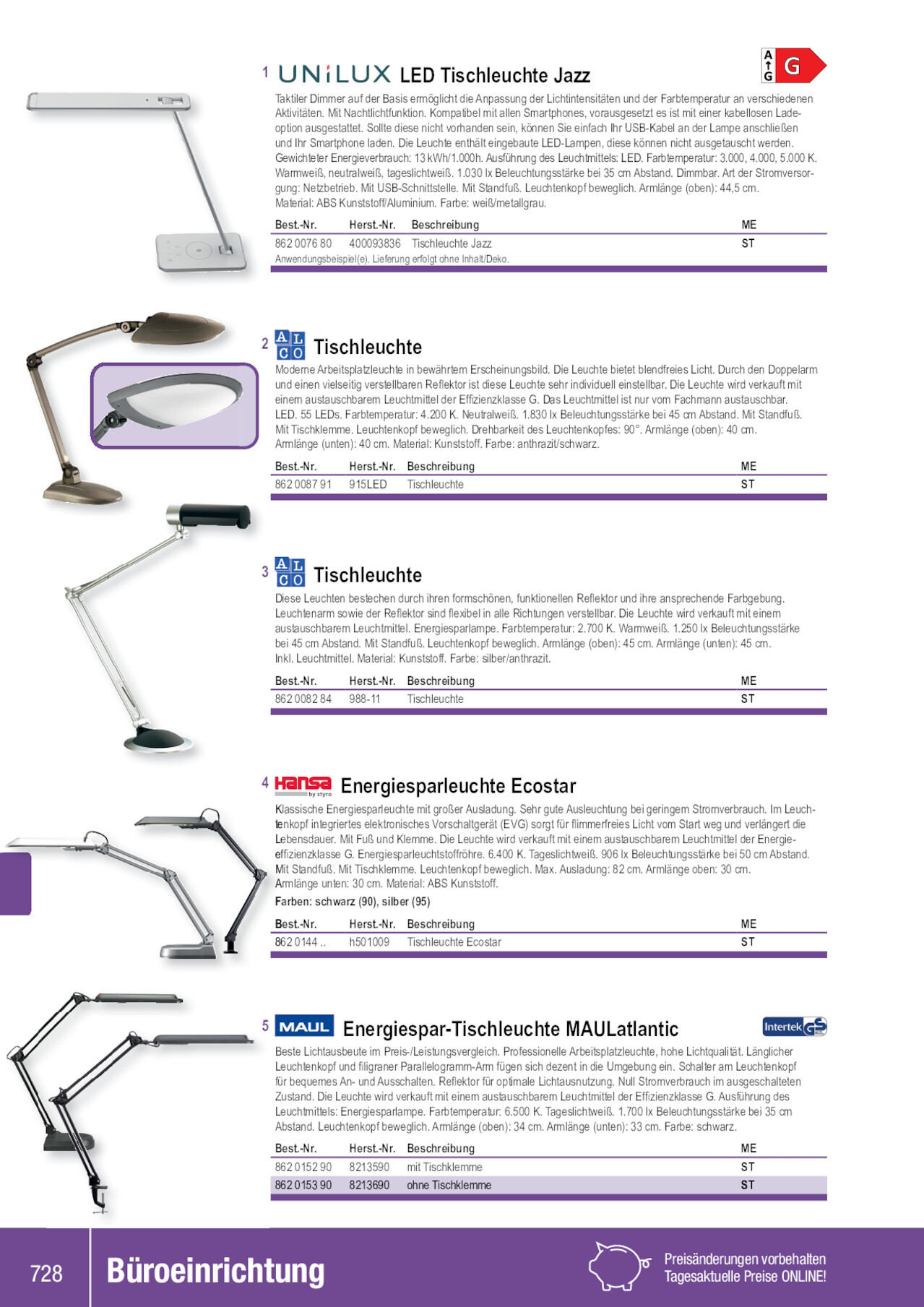 1 LED Tischleuchte Jazz Taktiler Dimmer auf der Basis ermöglicht die Anpassung der Lichtintensitäten und der Farbtemperatur an verschiedenen Aktivitäten. Mit Nachtlichtfunktion. Kompatibel mit allen Smartphones, vorausgesetzt es ist mit einer kabellosen Ladeoption ausgestattet. Sollte diese nicht vorhanden sein, können Sie einfach Ihr USB-Kabel an der Lampe anschließen und Ihr Smartphone laden. Die Leuchte enthält eingebaute LED-Lampen, diese können nicht ausgetauscht werden. Gewichteter Energieverbrauch: 13 kWh/1.000h. Ausführung des Leuchtmittels: LED. Farbtemperatur: 3.000, 4.000, 5.000 K. Warmweiß, neutralweiß, tageslichtweiß. 1.030 lx Beleuchtungsstärke bei 35 cm Abstand. Dimmbar. Art der Stromversorgung: Netzbetrieb. Mit USB-Schnittstelle. Mit Standfuß. Leuchtenkopf beweglich. Armlänge (oben): 44,5 cm. Material: ABS Kunststoff/Aluminium. Farbe: weiß/metallgrau. Best.-Nr. Herst.-Nr. Beschreibung 862 0076 80 400093836 Tischleuchte Jazz Anwendungsbeispiel(e). Lieferung erfolgt ohne Inhalt/Deko. ME ST 2 Tischleuchte Moderne Arbeitsplatzleuchte in bewährtem Erscheinungsbild. Die Leuchte bietet blendfreies Licht. Durch den Doppelarm und einen vielseitig verstellbaren Reflektor ist diese Leuchte sehr individuell einstellbar. Die Leuchte wird verkauft mit einem austauschbarem Leuchtmittel der Effizienzklasse G. Das Leuchtmittel ist nur vom Fachmann austauschbar. LED. 55 LEDs. Farbtemperatur: 4.200 K. Neutralweiß. 1.830 lx Beleuchtungsstärke bei 45 cm Abstand. Mit Standfuß. Mit Tischklemme. Leuchtenkopf beweglich. Drehbarkeit des Leuchtenkopfes: 90°. Armlänge (oben): 40 cm. Armlänge (unten): 40 cm. Material: Kunststoff. Farbe: anthrazit/schwarz. Best.-Nr. Herst.-Nr. Beschreibung 862 0087 91 915LED Tischleuchte ME ST 3 Tischleuchte Diese Leuchten bestechen durch ihren formschönen, funktionellen Reflektor und ihre ansprechende Farbgebung. Leuchtenarm sowie der Reflektor sind flexibel in alle Richtungen verstellbar. Die Leuchte wird verkauft mit einem austauschbarem Leuchtmittel. Energiesparlampe. Farbtemperatur: 2.700 K. Warmweiß. 1.250 lx Beleuchtungsstärke bei 45 cm Abstand. Mit Standfuß. Leuchtenkopf beweglich. Armlänge (oben): 45 cm. Armlänge (unten): 45 cm. Inkl. Leuchtmittel. Material: Kunststoff. Farbe: silber/anthrazit. Best.-Nr. Herst.-Nr. Beschreibung 862 0082 84 988-11 Tischleuchte ME ST 4 Energiesparleuchte Ecostar Klassische Energiesparleuchte mit großer Ausladung. Sehr gute Ausleuchtung bei geringem Stromverbrauch. Im Leuchtenkopf integriertes elektronisches Vorschaltgerät (EVG) sorgt für flimmerfreies Licht vom Start weg und verlängert die Lebensdauer. Mit Fuß und Klemme. Die Leuchte wird verkauft mit einem austauschbarem Leuchtmittel der Energieeffizienzklasse G. Energiesparleuchtstoffröhre. 6.400 K. Tageslichtweiß. 906 lx Beleuchtungsstärke bei 50 cm Abstand. Mit Standfuß. Mit Tischklemme. Leuchtenkopf beweglich. Max. Ausladung: 82 cm. Armlänge oben: 30 cm. Armlänge unten: 30 cm. Material: ABS Kunststoff. Farben: schwarz (90), silber (95) Best.-Nr. 862 0144 .. Herst.-Nr. Beschreibung h501009 Tischleuchte Ecostar ME ST 5 Energiespar-Tischleuchte MAULatlantic Beste Lichtausbeute im Preis-/Leistungsvergleich. Professionelle Arbeitsplatzleuchte, hohe Lichtqualität. Länglicher Leuchtenkopf und filigraner Parallelogramm-Arm fügen sich dezent in die Umgebung ein. Schalter am Leuchtenkopf für bequemes An- und Ausschalten. Reflektor für optimale Lichtausnutzung. Null Stromverbrauch im ausgeschalteten Zustand. Die Leuchte wird verkauft mit einem austauschbarem Leuchtmittel der Effizienzklasse G. Ausführung des Leuchtmittels: Energiesparlampe. Farbtemperatur: 6.500 K. Tageslichtweiß. 1.700 lx Beleuchtungsstärke bei 35 cm Abstand. Leuchtenkopf beweglich. Armlänge (oben): 34 cm. Armlänge (unten): 33 cm. Farbe: schwarz. Best.-Nr. 862 0152 90 862 0153 90 Herst.-Nr. Beschreibung 8213590 mit Tischklemme 8213690 ohne Tischklemme ME ST ST 728 Büroeinrichtung Preisänderungen vorbehalten Tagesaktuelle Preise ONLINE!