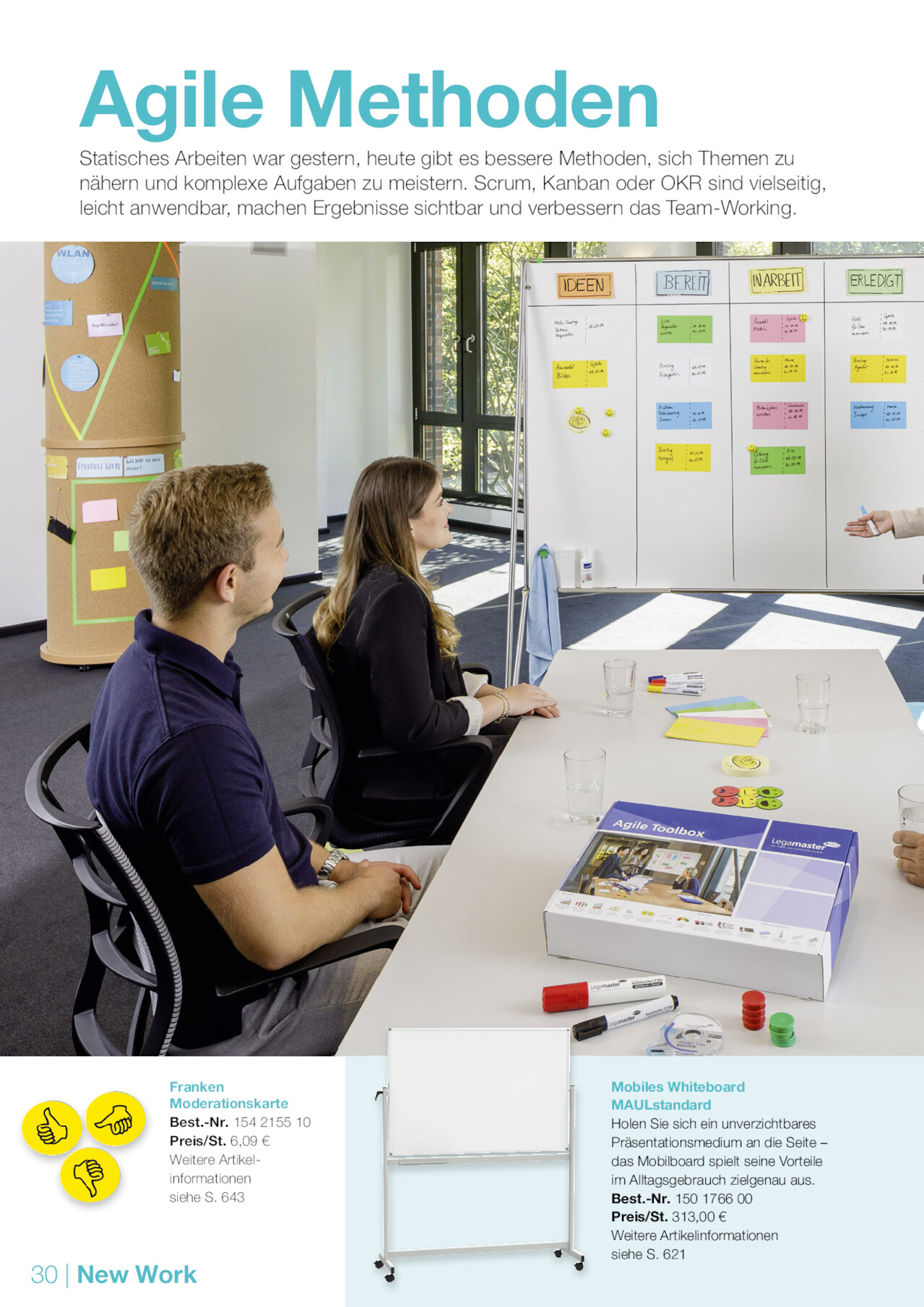 Agile Methoden Statisches Arbeiten war gestern, heute gibt es bessere Methoden, sich Themen zu nähern und komplexe Aufgaben zu meistern. Scrum, Kanban oder OKR sind vielseitig, leicht anwendbar, machen Ergebnisse sichtbar und verbessern das Team-Working. Franken Moderationskarte Best.-Nr. 154 2155 10 Preis/St. 6,09 € Weitere Artikelinformationen siehe S. 643 30 | New Work Mobiles Whiteboard MAULstandard Holen Sie sich ein unverzichtbares Präsentationsmedium an die Seite – das Mobilboard spielt seine Vorteile im Alltagsgebrauch zielgenau aus. Best.-Nr. 150 1766 00 Preis/St. 313,00 € Weitere Artikelinformationen siehe S. 621 154053899 150176600
