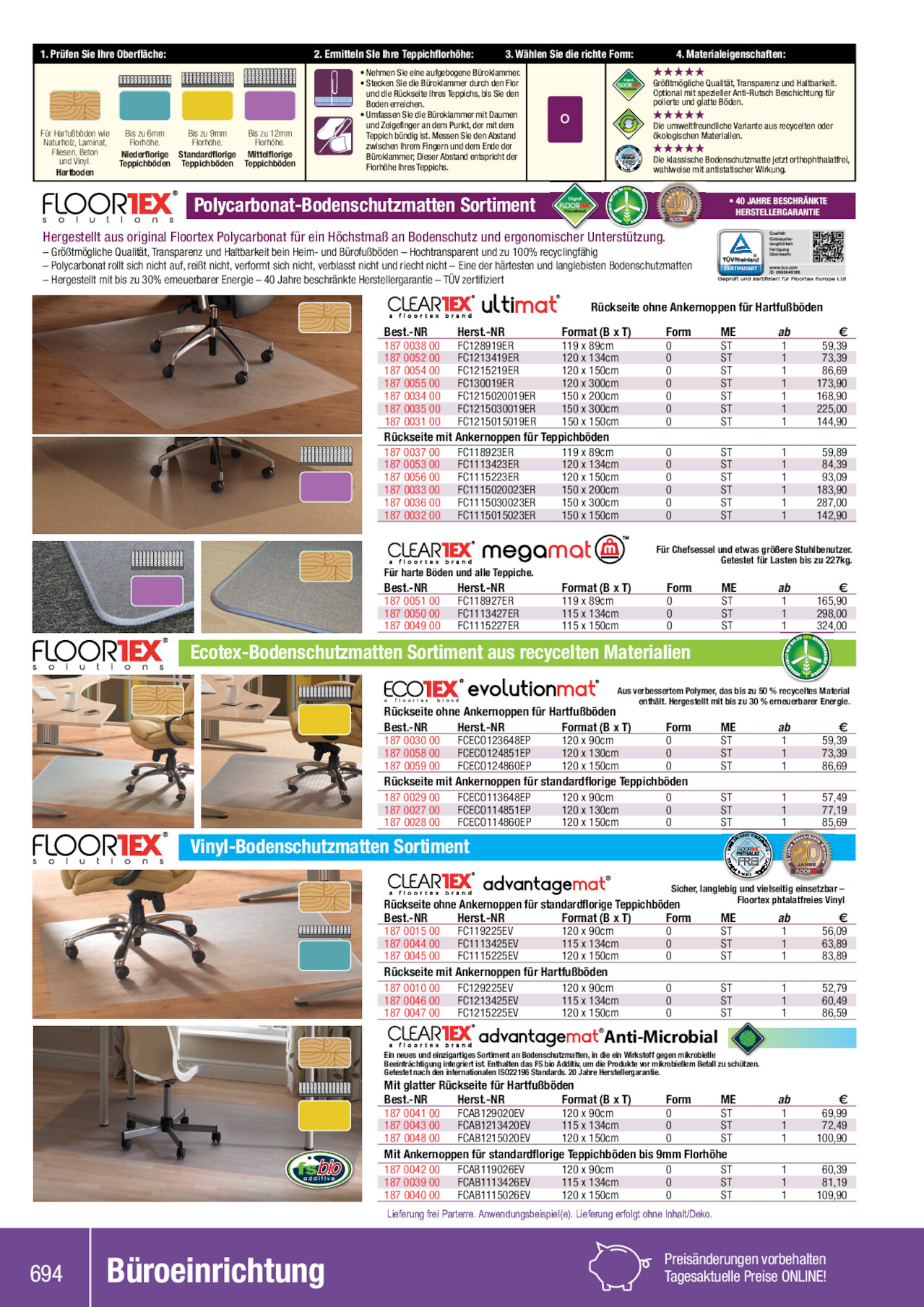 RGIE HER RGIE HER 1. Prüfen Sie Ihre Ober äche: Für Harfußböden wie Naturholz, Laminat, Fliesen, Beton und Vinyl. Hartboden Bis zu 6mm Florhöhe. Niederflorige Teppichböden Bis zu 9mm Florhöhe. Standardflorige Teppichböden Bis zu 12mm Florhöhe. Mittelflorige Teppichböden 2. Ermitteln SIe Ihre Teppich orhöhe: 3. Wählen Sie die richte Form: • Nehmen Sie eine aufgebogene Büroklammer. • Stecken Sie die Büroklammer durch den Flor und die Rückseite Ihres Teppichs, bis Sie den Boden erreichen. • Umfassen Sie die Büroklammer mit Daumen und Zeigefinger an dem Punkt, der mit dem Teppich bündig ist. Messen Sie den Abstand zwischen Ihrem Fingern und dem Ende der Büroklammer; Dieser Abstand entspricht der Florhöhe Ihres Teppichs. O ® 4. Materialeigenschaften: Größtmögliche Qualität, Transparenz und Haltbarkeit. Optional mit spezieller Anti-Rutsch Beschichtung für polierte und glatte Böden. Die umweltfreundliche Variante aus recycelten oder ökologischen Materialien. Die klassische Bodenschutzmatte jetzt orthophthalatfrei, wahlweise mit antistatischer Wirkung. GESTELLT MIT B 40 Jahre Garantie EUERBARER ENE Polycarbonat-Bodenschutzmatten Sortiment IS ZU 30% ERN ® beschränkte JAHRE • 40 JAHRE BESCHRÄNKTE HERSTELLERGARANTIE Hergestellt aus original Floortex Polycarbonat für ein Höchstmaß an Bodenschutz und ergonomischer Unterstützung. – Größtmögliche Qualität, Transparenz und Haltbarkeit bein Heim- und Bürofußböden – Hochtransparent und zu 100% recyclingfähig – Polycarbonat rollt sich nicht auf, reißt nicht, verformt sich nicht, verblasst nicht und riecht nicht – Eine der härtesten und langlebisten Bodenschutzmatten – Hergestellt mit bis zu 30% erneuerbarer Energie – 40 Jahre beschränkte Herstellergarantie – TÜV zerti ziert Rückseite ohne Ankernoppen für Hartfußböden Best.-NR Herst.-NR Format (B x T) 187 0038 00 FC128919ER 119 x 89cm 187 0052 00 FC1213419ER 120 x 134cm 187 0054 00 FC1215219ER 120 x 150cm 187 0055 00 FC130019ER 120 x 300cm 187 0034 00 FC1215020019ER 150 x 200cm 187 0035 00 FC1215030019ER 150 x 300cm 187 0031 00 FC1215015019ER 150 x 150cm Rückseite mit Ankernoppen für Teppichböden 187 0037 00 FC118923ER 119 x 89cm 187 0053 00 FC1113423ER 120 x 134cm 187 0056 00 FC1115223ER 120 x 150cm 187 0033 00 FC1115020023ER 150 x 200cm 187 0036 00 FC1115030023ER 150 x 300cm 187 0032 00 FC1115015023ER 150 x 150cm Form 0 0 0 0 0 0 0 0 0 0 0 0 0 ME ST ST ST ST ST ST ST ST ST ST ST ST ST ab € 1 59,39 1 73,39 1 86,69 1 173,90 1 168,90 1 225,00 1 144,90 1 59,89 1 84,39 1 93,09 1 183,90 1 287,00 1 142,90 Für Chefsessel und etwas größere Stuhlbenutzer. Getestet für Lasten bis zu 227kg. Für harte Böden und alle Teppiche. Best.-NR 187 0051 00 187 0050 00 187 0049 00 Herst.-NR FC118927ER FC1113427ER FC1115227ER Format (B x T) 119 x 89cm 115 x 134cm 115 x 150cm Form 0 0 0 ME ST ST ST ab € 1 165,90 1 298,00 1 324,00 Ecotex-Bodenschutzmatten Sortiment aus recycelten Materialien IS ZU 30% ERN GESTELLT MIT B EUERBARER ENE Aus verbessertem Polymer, das bis zu 50 % recyceltes Material Rückseite ohne Ankernoppen für Hartfußböden enthält. Hergestellt mit bis zu 30 % erneuerbarer Energie. Best.-NR 187 0030 00 187 0058 00 187 0059 00 Herst.-NR FCECO123648EP FCECO124851EP FCECO124860EP Format (B x T) 120 x 90cm 120 x 130cm 120 x 150cm Form 0 0 0 ME ST ST ST ab € 1 59,39 1 73,39 1 86,69 Rückseite mit Ankernoppen für standard orige Teppichböden 187 0029 00 FCECO113648EP 120 x 90cm 0 ST 1 57,49 187 0027 00 FCECO114851EP 120 x 130cm 0 ST 1 77,19 187 0028 00 FCECO114860EP 120 x 150cm 0 ST 1 85,69 Vinyl-Bodenschutzmatten Sortiment Sicher, langlebig und vielseitig einsetzbar – Rückseite ohne Ankernoppen für standard orige Teppichböden Floortex phtalatfreies Vinyl Best.-NR Herst.-NR Format (B x T) Form ME ab € 187 0015 00 FC119225EV 120 x 90cm 0 ST 1 56,09 187 0044 00 FC1113425EV 115 x 134cm 0 ST 1 63,89 187 0045 00 FC1115225EV 120 x 150cm 0 ST 1 83,89 Rückseite mit Ankernoppen für Hartfußböden 187 0010 00 FC129225EV 120 x 90cm 0 ST 1 52,79 187 0046 00 FC1213425EV 115 x 134cm 0 ST 1 60,49 187 0047 00 FC1215225EV 120 x 150cm 0 ST 1 86,59 Anti-Microbial Ein neues und einzigartiges Sortiment an Bodenschutzmatten, in die ein Wirkstoff gegen mikrobielle Beeinträchtigung integriert ist. Enthalten das FS bio Additiv, um die Produkte vor mikrobiellem Befall zu schützen. Getestet nach den internationalen ISO22196 Standards. 20 Jahre Herstellergarantie. Mit glatter Rückseite für Hartfußböden Best.-NR Herst.-NR Format (B x T) Form ME 187 0041 00 FCAB129020EV 120 x 90cm 0 ST 187 0043 00 FCAB1213420EV 115 x 134cm 0 ST 187 0048 00 FCAB1215020EV 120 x 150cm 0 ST Mit Ankernoppen für standard orige Teppichböden bis 9mm Florhöhe 187 0042 00 FCAB119026EV 120 x 90cm 0 ST 187 0039 00 FCAB1113426EV 115 x 134cm 0 ST 187 0040 00 FCAB1115026EV 120 x 150cm 0 ST ab 1 1 1 1 1 1 € 69,99 72,49 100,90 60,39 81,19 109,90 LLiiefferruunngg ffrreii PPaarrtterrrre.. AAnnwwenndduunnggssbbeiissppiiell((e)).. LLiiefferruunngg errffoollggtt oohhnne IInnhhaalltt//DDekkoo.. 694 Büroeinrichtung Preisänderungen vorbehalten Tagesaktuelle Preise ONLINE! 187004700 187003300 187001500 187005300 187004400 187001000 187003000 187004900 187003800 187003100 187005500 187003200 187005000 187003900 187005400 187004200 187004600 187004500 187003400 187002700 187004800 187004300 187004100 187002800 187003700 187005200 187005800 187005100 187003600 187004000 187005600 187002900 187005900 187003500