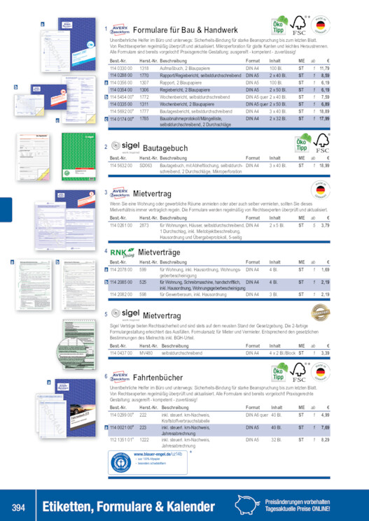 a b c ab a * 1 Formulare für Bau & Handwerk Unentbehrliche Helfer im Büro und unterwegs: Sicherheits-Bindung für starke Beanspruchung bis zum letzten Blatt. Von Rechtsexperten regelmäßig überprüft und aktualisiert. Mikroperforation für glatte Kanten und leichtes Heraustrennen. Alle Formulare sind bereits vorgelocht! Praxisgerechte Gestaltung: ausgereift - kompetent - zuverlässig! Best.-Nr. 114 0330 00 114 0288 00 a 114 0356 00 114 0354 00 b 114 5454 00* 114 0335 00 114 5692 00* c 114 0174 00* Herst.-Nr. Beschreibung 1318 Aufmaßbuch, 2 Blaupapiere 1770 Rapport/Regiebericht, selbstdurchschreibend 1307 Rapport, 2 Blaupapiere 1306 Regiebericht, 2 Blaupapiere 1772 Wochenbericht, selbstdurchschreibend 1311 Wochenbericht, 2 Blaupapiere 1777 Bautagesbericht, selbstdurchschreibend 1785 Bauabnahmeprotokoll/Mängelliste, selbstdurchschreibend, 2 Durchschläge Format Inhalt DIN A4 100 Bl. DIN A5 2 x 40 Bl. DIN A5 100 Bl. DIN A5 2 x 50 Bl. DIN A5 quer 2 x 40 Bl. DIN A5 quer 2 x 50 Bl. DIN A4 3 x 40 Bl. DIN A4 2 x 32 Bl. ME ab € ST 1 11,79 ST 1 8,59 ST 1 6,19 ST 1 6,19 ST 1 7,59 ST 1 6,89 ST 1 18,89 ST 1 17,99 2 Best.-Nr. 114 5632 00 Bautagebuch Herst.-Nr. Beschreibung Format SD063 Bautagebuch, mit Abheftlochung, selbstdurch- DIN A4 schreibend, 2 Durchschläge, Mikroperforation Inhalt 3 x 40 Bl. ME ab € ST 1 18,99 3 Mietvertrag Wenn Sie eine Wohnung oder gewerbliche Räume anmieten oder aber auch selber vermieten, sollten Sie dieses Mietverhältnis immer vertraglich regeln. Die Formulare werden regelmäßig von Rechtsexperten überprüft und aktualisiert. Best.-Nr. 114 0261 00 Herst.-Nr. Beschreibung Format 2873 für Wohnungen, Häuser, selbstdurchschreibend, DIN A4 1 Durchschlag, inkl. Mietobjektbeschreibung, Hausordnung und Übergabeprotokoll, 5-seitig Inhalt 2 x 5 Bl. ME ab € ST 5 3,79 4 Best.-Nr. a 114 2078 00 b 114 2085 00 114 2082 00 Mietverträge Herst.-Nr. Beschreibung Format 599 für Wohnung, inkl. Hausordnung, Wohnungs- DIN A4 geberbescheinigung 525 für Wohnung, Schreibmaschine, handschriftlich, DIN A4 inkl. Hausordnung, Wohnungsgeberbescheinigung 598 für Gewerberaum, inkl. Hausordnung DIN A4 Inhalt 4 Bl. 4 Bl. 3 Bl. ME ab € ST 1 1,69 ST 1 2,19 ST 1 2,19 5 Mietvertrag Sigel Verträge bieten Rechtssicherheit und sind stets auf dem neusten Stand der Gesetzgebung. Die 2-farbige Formulargestaltung erleichtert das Ausfüllen. Formularsatz für Mieter und Vermieter. Entsprechend den gesetzlichen Bestimmungen des Mietrechts inkl. BGH-Urteil. Best.-Nr. Herst.-Nr. Beschreibung 114 0437 00 MV480 selbstdurchschreibend Format DIN A4 Inhalt ME ab € 4 x 2 Bl./Block ST 1 3,39 * 6 Fahrtenbücher Unentbehrliche Helfer im Büro und unterwegs: Sicherheits-Bindung für starke Beanspruchung bis zum letzten Blatt. Von Rechtsexperten regelmäßig überprüft und aktualisiert. Alle Formulare sind bereits vorgelocht! Praxisgerechte Gestaltung: ausgereift - kompetent - zuverlässig! Best.-Nr. 114 0299 00* a 114 0021 00* 112 1351 01* Herst.-Nr. Beschreibung 222 inkl. steuerl. km-Nachweis, Kraftstoffverbrauchstabelle 223 inkl. steuerl. km-Nachweis, Jahresabrechnung 1222 inkl. steuerl. km-Nachweis, Jahresabrechnung * Format Inhalt DIN A6 quer 40 Bl. DIN A5 40 Bl. DIN A5 32 Bl. ME ab € ST 1 4,99 ST 1 7,69 ST 1 8,29 394 Etiketten, Formulare & Kalender Preisänderungen vorbehalten Tagesaktuelle Preise ONLINE! 114017400 114545400 114028800 114033500 114029900 114002100 114208200 114035600 114569200 114026100 114208500 114207800 112135101 114563200 114043700 114035400 114033000