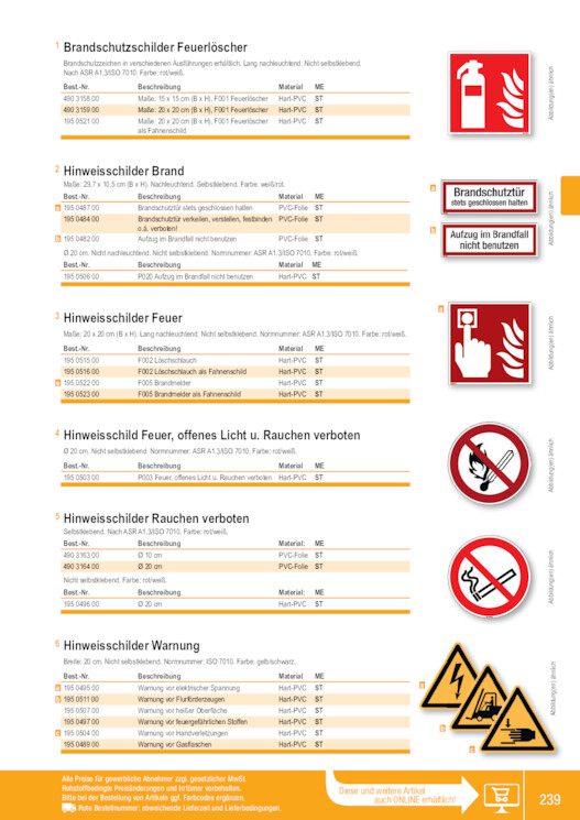 1 Brandschutzschilder Feuerlöscher Brandschutzzeichen in verschiedenen Ausführungen erhältlich. Lang nachleuchtend. Nicht selbstklebend. Nach ASR A1.3/ISO 7010. Farbe: rot/weiß. Best.-Nr. 490 3158 00 490 3159 00 195 0521 00 Beschreibung Maße: 15 x 15 cm (B x H), F001 Feuerlöscher Maße: 20 x 20 cm (B x H), F001 Feuerlöscher Maße: 20 x 20 cm (B x H), F001 Feuerlöscher als Fahnenschild Material Hart-PVC Hart-PVC Hart-PVC ME ST ST ST 2 Hinweisschilder Brand Maße: 29,7 x 10,5 cm (B x H). Nachleuchtend. Selbstklebend. Farbe: weiß/rot. Best.-Nr. a 195 0487 00 195 0484 00 b 195 0482 00 Beschreibung Material ME Brandschutztür stets geschlossen halten PVC-Folie ST Brandschutztür verkeilen, verstellen, festbinden PVC-Folie ST o.ä. verboten! Aufzug im Brandfall nicht benutzen PVC-Folie ST Ø 20 cm. Nicht nachleuchtend. Nicht selbstklebend. Normnummer: ASR A1.3/ISO 7010. Farbe: rot/weiß. Best.-Nr. 195 0506 00 Beschreibung P020 Aufzug im Brandfall nicht benutzen Material ME Hart-PVC ST a b 3 Hinweisschilder Feuer Maße: 20 x 20 cm (B x H). Lang nachleuchtend. Nicht selbstklebend. Normnummer: ASR A1.3/ISO 7010. Farbe: rot/weiß. Best.-Nr. 195 0515 00 195 0516 00 a 195 0522 00 195 0523 00 Beschreibung F002 Löschschlauch F002 Löschschlauch als Fahnenschild F005 Brandmelder F005 Brandmelder als Fahnenschild Material Hart-PVC Hart-PVC Hart-PVC Hart-PVC ME ST ST ST ST a 4 Hinweisschild Feuer, offenes Licht u. Rauchen verboten Ø 20 cm. Nicht selbstklebend. Normnummer: ASR A1.3/ISO 7010. Farbe: rot/weiß. Best.-Nr. 195 0503 00 Beschreibung Material ME P003 Feuer, offenes Licht u. Rauchen verboten Hart-PVC ST 5 Hinweisschilder Rauchen verboten Selbstklebend. Nach ASR A1.3/ISO 7010. Farbe: rot/weiß. Best.-Nr. Beschreibung 490 3163 00 Ø 10 cm 490 3164 00 Ø 20 cm Nicht selbstklebend. Farbe: rot/weiß. Best.-Nr. Beschreibung 195 0496 00 Ø 20 cm Material: ME PVC-Folie ST PVC-Folie ST Material: ME Hart-PVC ST 6 Hinweisschilder Warnung Breite: 20 cm. Nicht selbstklebend. Normnummer: ISO 7010. Farbe: gelb/schwarz. Best.-Nr. a 195 0495 00 b 195 0511 00 195 0507 00 195 0497 00 c 195 0504 00 195 0489 00 Beschreibung Warnung vor elektrischer Spannung Warnung vor Flurförderzeugen Warnung vor heißer Oberfläche Warnung vor feuergefährlichen Stoffen Warnung vor Handverletzungen Warnung vor Gasflaschen Material Hart-PVC Hart-PVC Hart-PVC Hart-PVC Hart-PVC Hart-PVC ME ST ST ST ST ST ST a b c Alle Preise für gewerbliche Abnehmer zzgl. gesetzlicher MwSt. Rohstoffbedingte Preisänderungen und Irrtümer vorbehalten. Bitte bei der Bestellung von Artikeln ggf. Farbcodes ergänzen. Rote Bestellnummer: abweichende Lieferzeit und Lieferbedingungen. Diese und weitere Artikel auch ONLINE erhältlich! Abbildung(en) ähnlich Abbildung(en) ähnlich Abbildung(en) ähnlich Abbildung(en) ähnlich Abbildung(en) ähnlich Abbildung(en) ähnlich 239