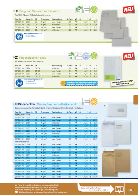 1 Recycling Versandtaschen oeco Aus 100 % Altpapier. Mit Selbstklebung. Farbe: grau. Best.-Nr. 327 2629 00 327 2627 00 327 2631 00 327 2623 00 Herst.-Nr. 2956 2945 2957 2939 DIN C5 C5 C4 C4 Grammatur 80 g/m² 80 g/m² 100 g/m² 100 g/m² Beschreibung ohne Fenster mit Fenster ohne Fenster mit Fenster St./Pack. ME ab € ab € 500 PA 1 13,69 4 13,09 500 PA 1 14,69 4 13,99 250 PA 1 13,29 5 12,59 250 PA 1 13,89 5 13,29 2 Versandtaschen oeco Mit Haftklebung. Material: Recyclingpapier. Best.-Nr. 327 2622 00 327 2625 00 327 2628 00 327 2619 00 Herst.-Nr. 2938 2940 2951 2934 DIN DIN C4 DIN C4 DIN C5 DIN C5 Beschreibung mit Fenster ohne Fenster ohne Fenster mit Fenster St./Pack. 15 15 15 15 ME PA PA PA PA ab 1 1 1 1 € ab 6,99 5 6,99 5 6,49 5 6,49 5 € 6,59 6,59 6,19 6,19 Verpackt mit Hilfe der elbe werkstätten gmbh. Weitere Infos hierzu finden Sie auf Seite 51. Die öKkloeliongviesrcphacnkaucnhghaltige 3 Versandtaschen selbstklebend Soennecken Versandtaschen selbstklebend - einfach umklappen und fertig. Einfachste Handhabung. Best.-Nr. Herst.-Nr. holzfrei, Farbe: weiß 327 5187 00 2101 327 2136 01 2927 327 3107 01 2100 a 327 2135 01 2944 327 6648 01 2107 327 2119 01 2954 327 6669 01 2088 b 327 2120 01 2946 327 2142 01 2909 Farbe: natronbraun 327 1648 00 2069 327 2132 70 2950 327 2134 70 2928 327 7933 00 2068 327 2133 70 2937 327 6678 70 2106 327 2122 70 2953 c 327 1999 00 2067 327 2121 70 2087 327 6679 70 2108 327 2143 70 2910 327 2144 70 2952 327 2146 70 2904 DIN C5 C5 C5 C5 C4 C4 C4 C4 B4 C5 C5 C5 C5 C5 C4 C4 C4 C4 B4 B4 B4 B5 Grammatur Beschreibung 90 g/m² 90 g/m² 90 g/m² 90 g/m² 100 g/m² 100 g/m² 100 g/m² 100 g/m² 100 g/m² ohne Fenster ohne Fenster mit Fenster mit Fenster ohne Fenster ohne Fenster mit Fenster mit Fenster ohne Fenster 90 g/m² 70 g/m² 90 g/m² 90 g/m² 90 g/m² 90 g/m² 90 g/m² 90 g/m² 90 g/m² 110 g/m² 90 g/m² 110 g/m² 90 g/m² ohne Fenster ohne Fenster ohne Fenster mit Fenster mit Fenster ohne Fenster ohne Fenster mit Fenster mit Fenster ohne Fenster ohne Fenster ohne Fenster ohne Fenster St./Pack. ME ab € ab € 25 PA 1 3,09 5 2,99 500 PA 1 26,79 4 25,79 25 PA 1 3,49 5 3,39 500 PA 1 25,99 4 24,69 25 PA 1 5,69 5 5,59 250 PA 1 15,39 5 14,89 25 PA 1 5,49 5 5,39 250 PA 1 18,79 5 16,59 250 PA 1 31,29 4 30,09 25 PA 1 2,89 5 2,79 500 PA 1 21,19 4 20,09 500 PA 1 17,09 4 16,09 25 PA 1 2,99 5 2,89 500 PA 1 18,59 4 17,59 25 PA 1 4,69 5 4,49 250 PA 1 15,09 4 14,39 25 PA 1 3,99 5 3,79 250 PA 1 16,89 4 15,09 25 PA 1 6,59 5 6,39 250 PA 1 34,39 5 33,29 250 PA 1 19,19 5 18,09 500 PA 1 26,29 5 24,39 a b c Alle Preise für gewerbliche Abnehmer zzgl. gesetzlicher MwSt. Rohstoffbedingte Preisänderungen und Irrtümer vorbehalten. Bitte bei der Bestellung von Artikeln ggf. Farbcodes ergänzen. Rote Bestellnummer: abweichende Lieferzeit und Lieferbedingungen. Diese und weitere Artikel auch ONLINE erhältlich! 503 327213270 327214370 327214470 327214670 327518700 327212001 327666901 327213501 327667970 327664801 327164800 327199900 327667870 327211901 327310701 327212170 327213601 327213470 327214201 327213370 327212270 327793300