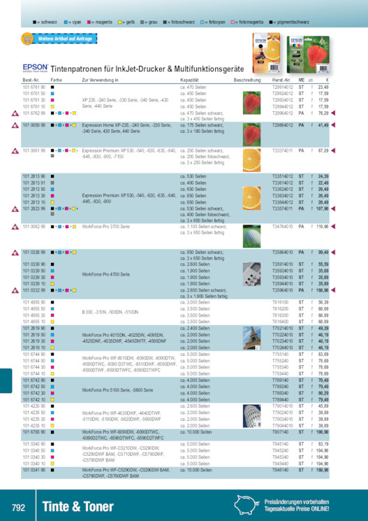 = schwarz = cyan = magenta = gelb = grau = fotoschwarz = fotocyan = fotomagenta = pigmentschwarz Weitere Artikel auf Anfrage Tintenpatronen für InkJet-Drucker & Multifunktionsgeräte Best.-Nr. 101 6761 90 101 6761 50 101 6761 30 101 6761 10 101 6762 99 Farbe ++ + 101 0059 99 + + + Zur Verwendung in XP 235, -240 Serie, -330 Serie, -340 Serie, -430 Serie, -440 Serie Expression Home XP-235, -240 Serie, -330 Serie, -340 Serie, 430 Serie, 440 Serie Kapazität ca. 470 Seiten ca. 450 Seiten ca. 450 Seiten ca. 450 Seiten ca. 470 Seiten schwarz, ca. 3 x 450 Seiten farbig ca. 175 Seiten schwarz, ca. 3 x 180 Seiten farbig Beschreibung Herst.-Nr. T29914012 T29924012 T29934012 T29944012 T29964012 ME ab ST 1 ST 1 ST 1 ST 1 PA 1 € 23,49 17,59 17,59 17,59 76,29 T29864012 PA 1 41,49 101 0061 99 + + + + Expression Premium XP 530, -540, -630, -635, -640, ca. 250 Seiten schwarz, -645, -830, -900, -7100 ca. 200 Seiten fotoschwarz, ca. 3 x 250 Seiten farbig 101 2813 90 101 2813 91 101 2813 50 101 2813 30 101 2813 10 101 2823 99 101 0062 99 ca. 530 Seiten ca. 400 Seiten ca. 650 Seiten Expression Premium XP 530, -540, -630, -635, -640, ca. 650 Seiten -645, -830, -900 ca. 650 Seiten ++++ ca. 530 Seiten schwarz, ca. 400 Seiten fotoschwarz, ca. 3 x 650 Seiten farbig + + + WorkForce Pro 3700 Serie ca. 1.100 Seiten schwarz, ca. 3 x 950 Seiten farbig T33374011 PA 1 67,29 T33514012 ST 1 24,39 T33614012 ST 1 22,49 T33624012 ST 1 20,49 T33634012 ST 1 20,49 T33644012 ST 1 20,49 T33574011 PA 1 107,90 T34764010 PA 1 110,90 101 0338 99 101 0339 90 101 0339 50 101 0339 30 101 0339 10 101 0332 99 101 4955 90 101 4955 50 101 4955 30 101 4955 10 101 2619 90 101 2619 50 101 2619 30 101 2619 10 101 6744 90 101 6744 50 101 6744 30 101 6744 10 101 6742 90 101 6742 50 101 6742 30 101 6742 10 101 4235 90 101 4235 50 101 4235 30 101 4235 10 101 6765 90 101 0340 90 101 0340 50 101 0340 30 101 0340 10 101 0341 90 +++ +++ ca. 950 Seiten schwarz, ca. 3 x 650 Seiten farbig ca. 2.600 Seiten WorkForce Pro 4700 Serie ca. 1.900 Seiten ca. 1.900 Seiten ca. 1.900 Seiten ca. 2.600 Seiten schwarz, ca. 3 x 1.900 Seiten farbig ca. 3.000 Seiten B 300, -310N, -500DN, -510DN ca. 3.500 Seiten ca. 3.500 Seiten ca. 3.500 Seiten ca. 2.400 Seiten WorkForce Pro 4015DN, -4025DW, -4095DN, ca. 2.000 Seiten -4525DNF, -4535DWF, -4545DWTF, -4595DNF ca. 2.000 Seiten ca. 2.000 Seiten ca. 5.000 Seiten WorkForce Pro WF-8010DW, -8090DW, -8090DTW, -8090DTWC, -8090 D3TWC, -8510DWF, -8590DWF, -8590DTWF, -8590DTWFC, -8590D3TWFC ca. 5.000 Seiten ca. 5.000 Seiten ca. 5.000 Seiten ca. 4.000 Seiten WorkForce Pro 5100 Serie, -5600 Serie ca. 4.000 Seiten ca. 4.000 Seiten ca. 4.000 Seiten ca. 2.600 Seiten WorkForce Pro WF-4630DWF, -4640DTWF, ca. 2.000 Seiten -5110DW, -5190DW, -5620DWF, -5690DWF ca. 2.000 Seiten ca. 2.000 Seiten WorkForce Pro WF-6090DW, -6090DTWC, ca. 10.000 Seiten -6090D2TWC, -6590DTWFC, -6590D2TWFC WorkForce Pro WF-C5210DW, -C5290DW, -C5290DWF BAM, -C5710DWF, -C5790DWF, -C5790DWF BAM ca. 5.000 Seiten ca. 5.000 Seiten ca. 5.000 Seiten ca. 5.000 Seiten WorkForce Pro WF-C5290DW, -C5290DW BAM, ca. 10.000 Seiten -C5790DWF, -C5790DWF BAM T35864010 PA 1 99,49 T35914010 ST 1 55,59 T35924010 ST 1 35,09 T35934010 ST 1 35,09 T35944010 ST 1 35,09 T35964010 PA 1 160,90 T616100 ST 1 50,39 T616200 ST 1 60,09 T616300 ST 1 60,09 T616400 ST 1 60,09 T70214010 ST 1 49,39 T70224010 ST 1 46,19 T70234010 ST 1 46,19 T70244010 ST 1 46,19 T755140 ST 1 83,09 T755240 ST 1 78,69 T755340 ST 1 78,69 T755440 ST 1 78,69 T789140 ST 1 70,49 T789240 ST 1 79,49 T789340 ST 1 80,29 T789440 ST 1 79,49 T79014010 ST 1 45,89 T79024010 ST 1 39,89 T79034010 ST 1 39,89 T79044010 ST 1 39,89 T907140 ST 1 100,90 T945140 T945240 T945340 T945440 T946140 ST 1 83,19 ST 1 104,90 ST 1 104,90 ST 1 104,90 ST 1 160,90 792 Tinte & Toner Preisänderungen vorbehalten Tagesaktuelle Preise ONLINE! 101674430 101033299 101034050 101674250 101676130 101495550 101423590 101676590 101495510 101282399 101006299 101423550 101281390 101034190 101674230 101034090 101423510 101674290 101033990 101676299 101006199 101676190 101261930 101261910 101033899 101281391 101674410 101281330 101034030 101034010 101033910 101033950 101676110 101674210 101281350 101495530 101261990 101495590 101674490 101033930 101261950 101281310 101674450 101676150 101005999 101423530